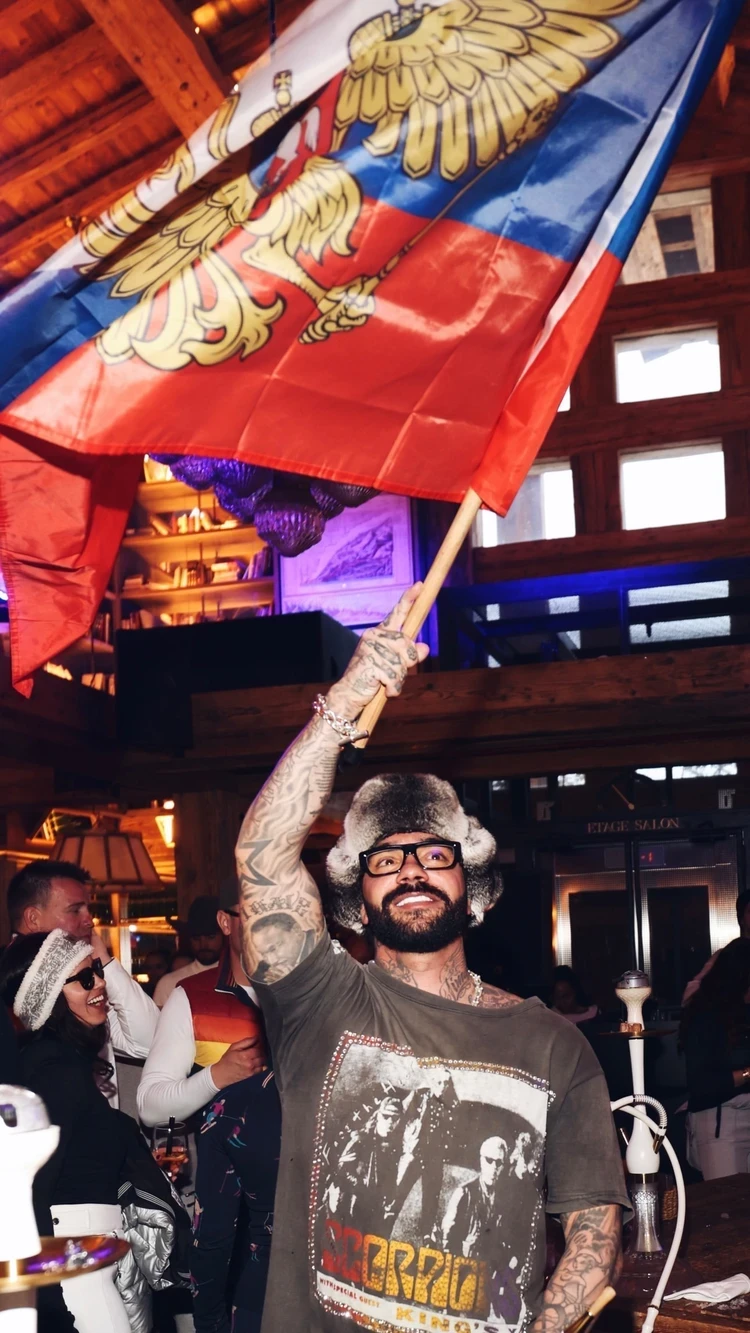 Тимати всю вечеринку проходил в меховой шапке и с триколором. Фото: соцсети.