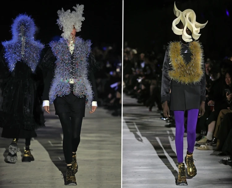 Японский дизайнер Кей Ниномия показал экстравагантные образы, которые зарубежные модные критики сравнили со светящимися морскими ежами. По всей видимости, костюмы были созданы с использованием светоотражающих элементов.