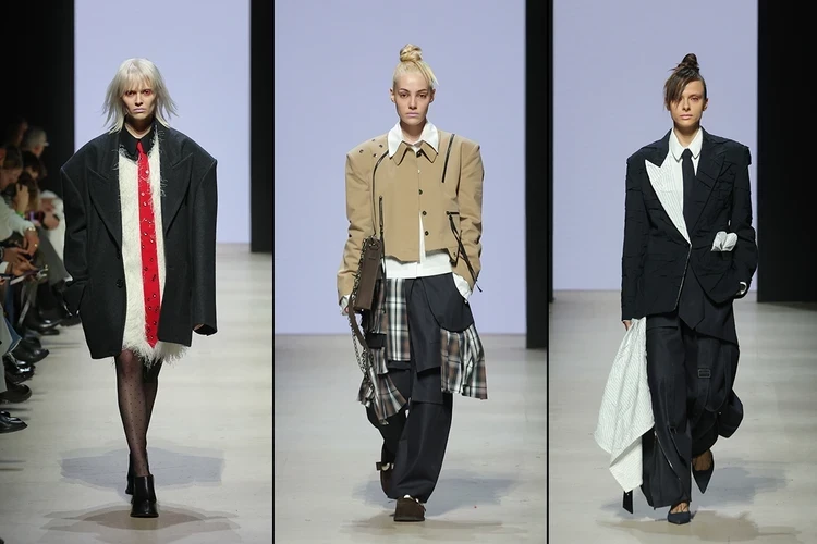 Московский бренд «ХакаМа» показал ассиметричные и многослойные образы, некоторые из которых смело можно отнести к современному офискору. Так, мы отметили лук с объемным жакетом, «волосатым» платьем и акцентным красным галстуком.