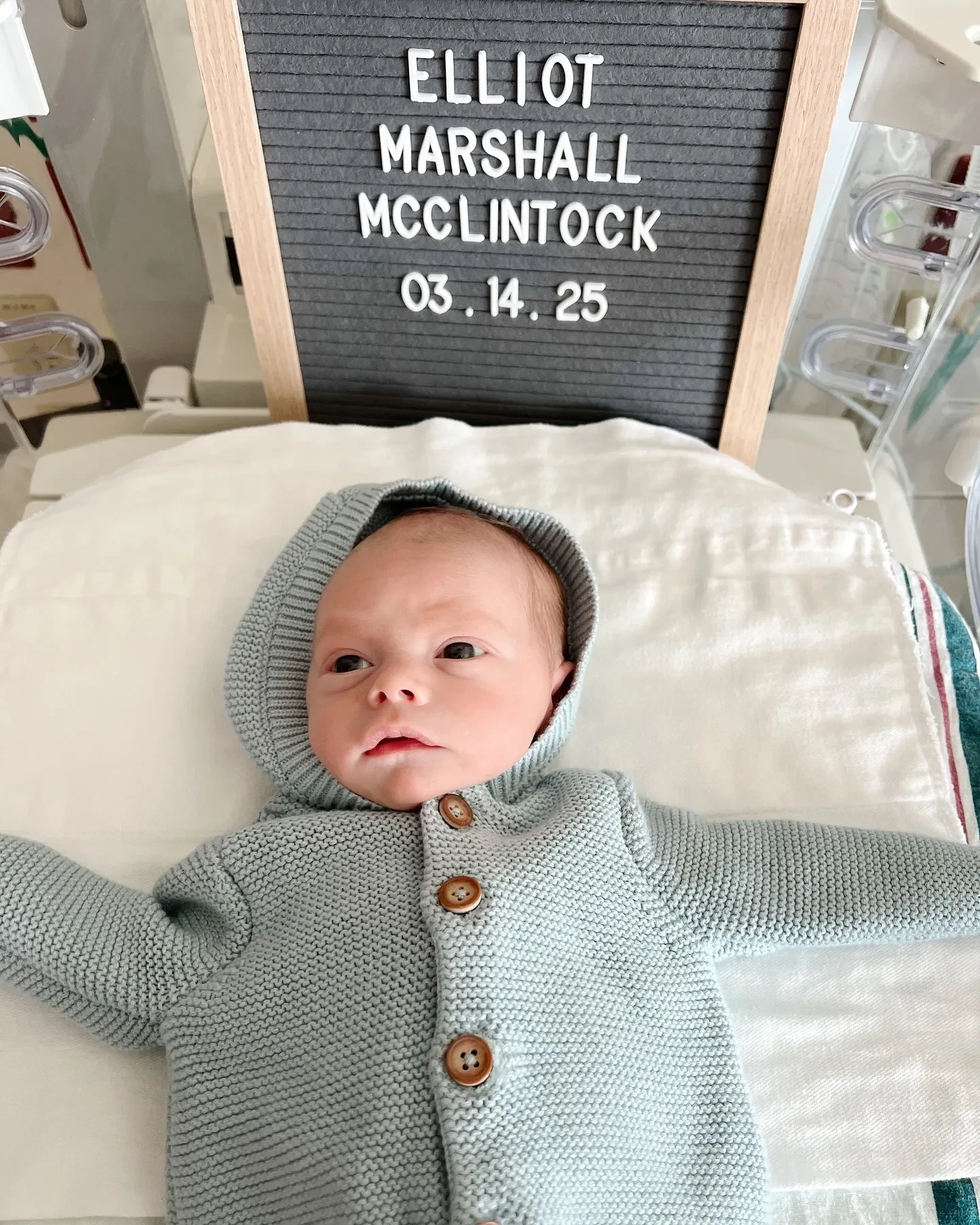 Судя по надписи на табличке, которую видно на фото, малыш родился 14 марта. Кроме того, там же указано, что мальчика назвали в честь знаменитого дедушки — Эллиот Маршалл.
