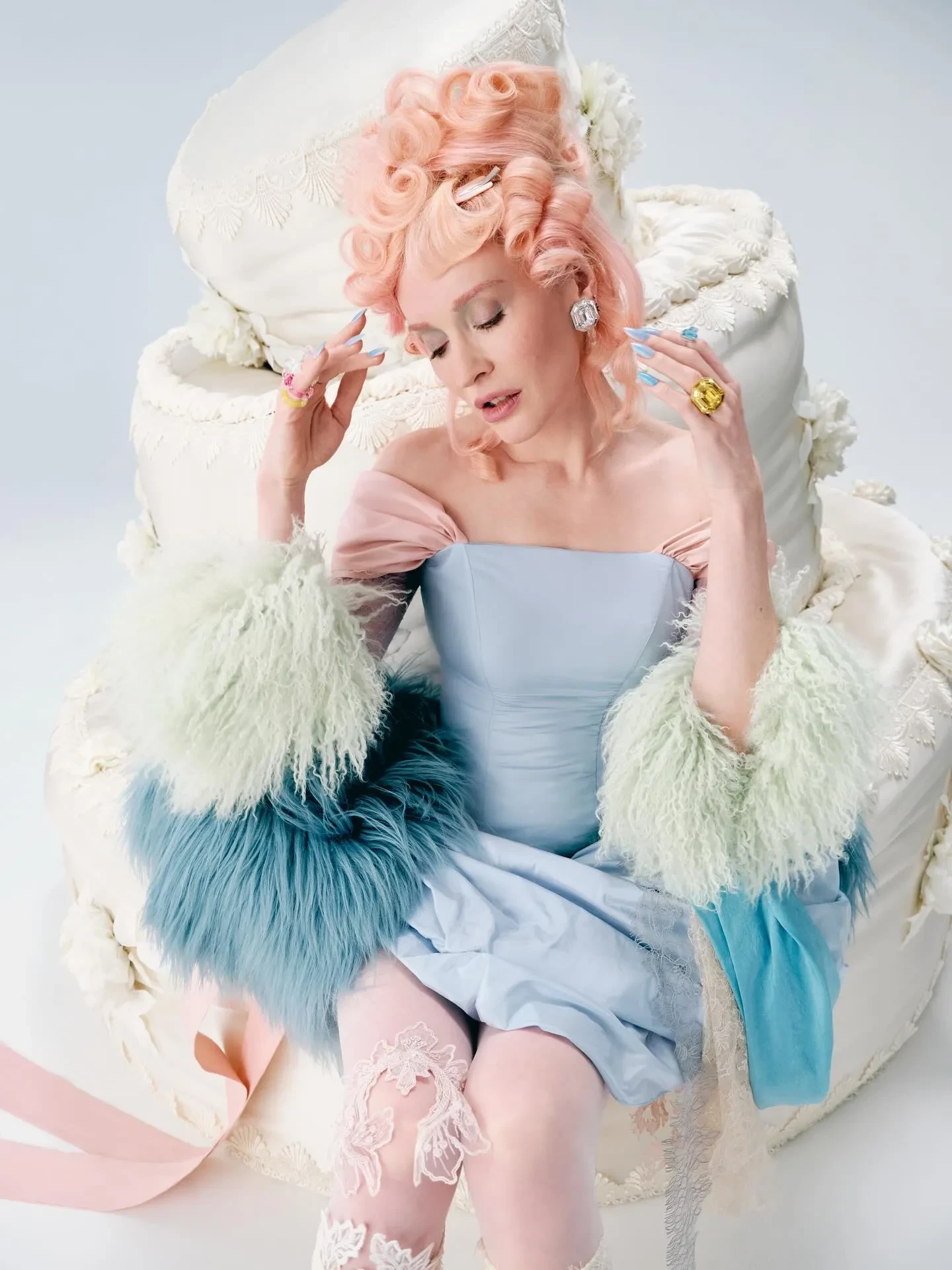 На фото Давыдова позирует на фоне большого декоративного торта. На ней голубое винтажное платье, полупрозрачные кружевные чулки и туфли на каблуке. Образ дополняют массивные украшения и узнаваемая высокая причёска с розовыми локонами. "С днём рождения меня", — подписала публикацию Наталья.