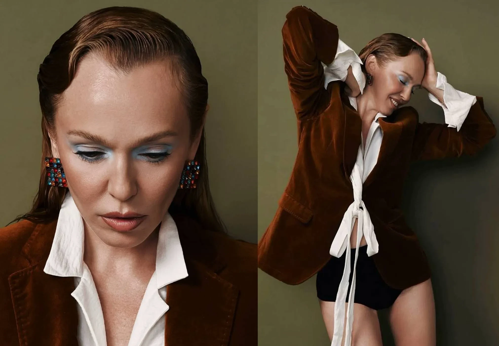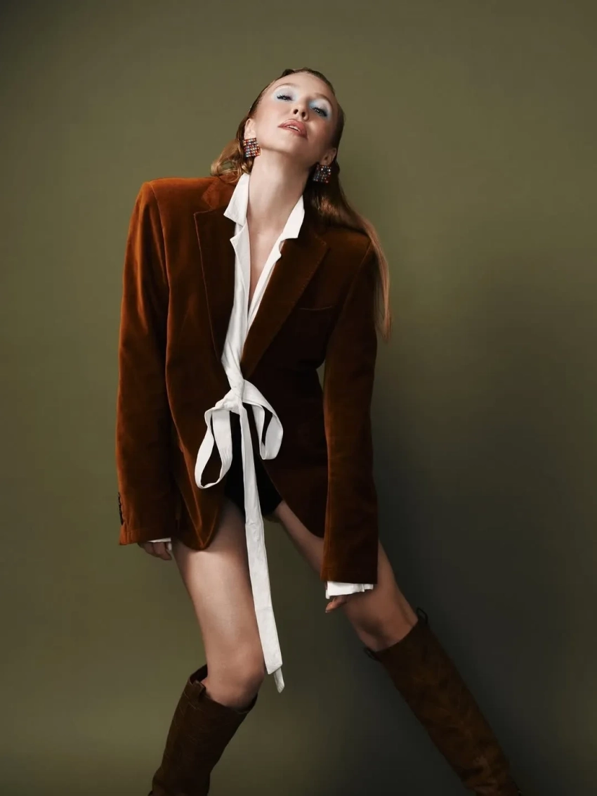 На снимках она предстала в чёрных микрошортах, белой блузке, коричневом пиджаке и коричневых сапогах, а также с ярким мейком авторства Станислава Кремлёва. В качестве фотографа выступила Дарья Морозова.