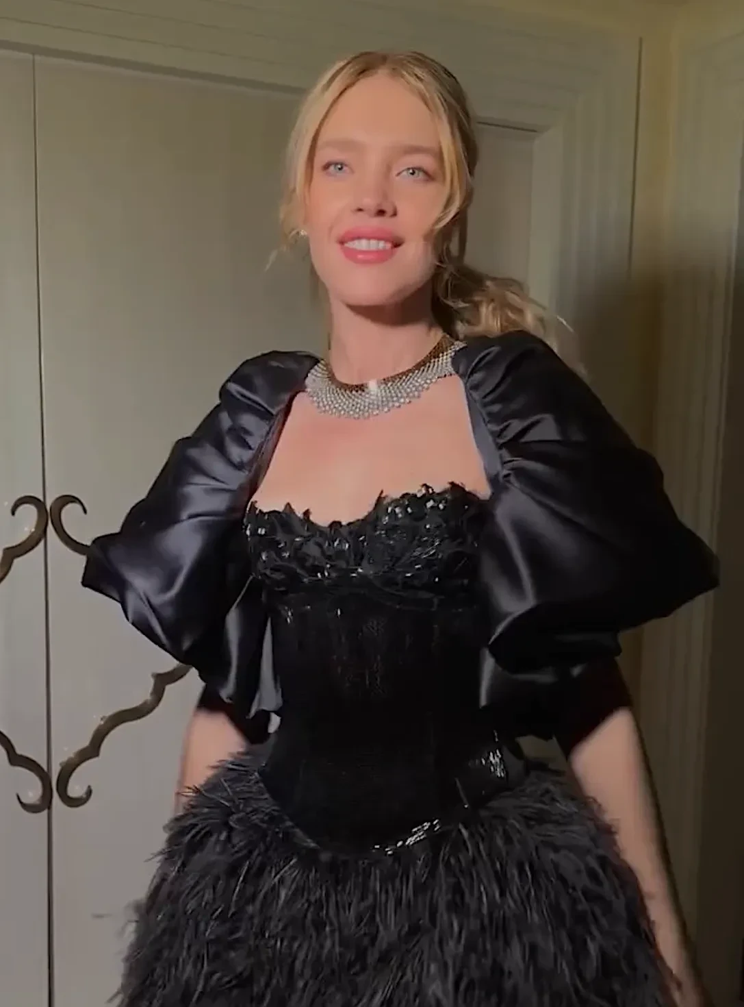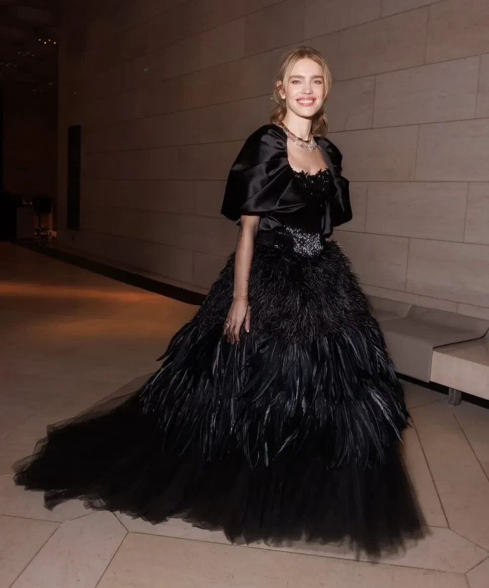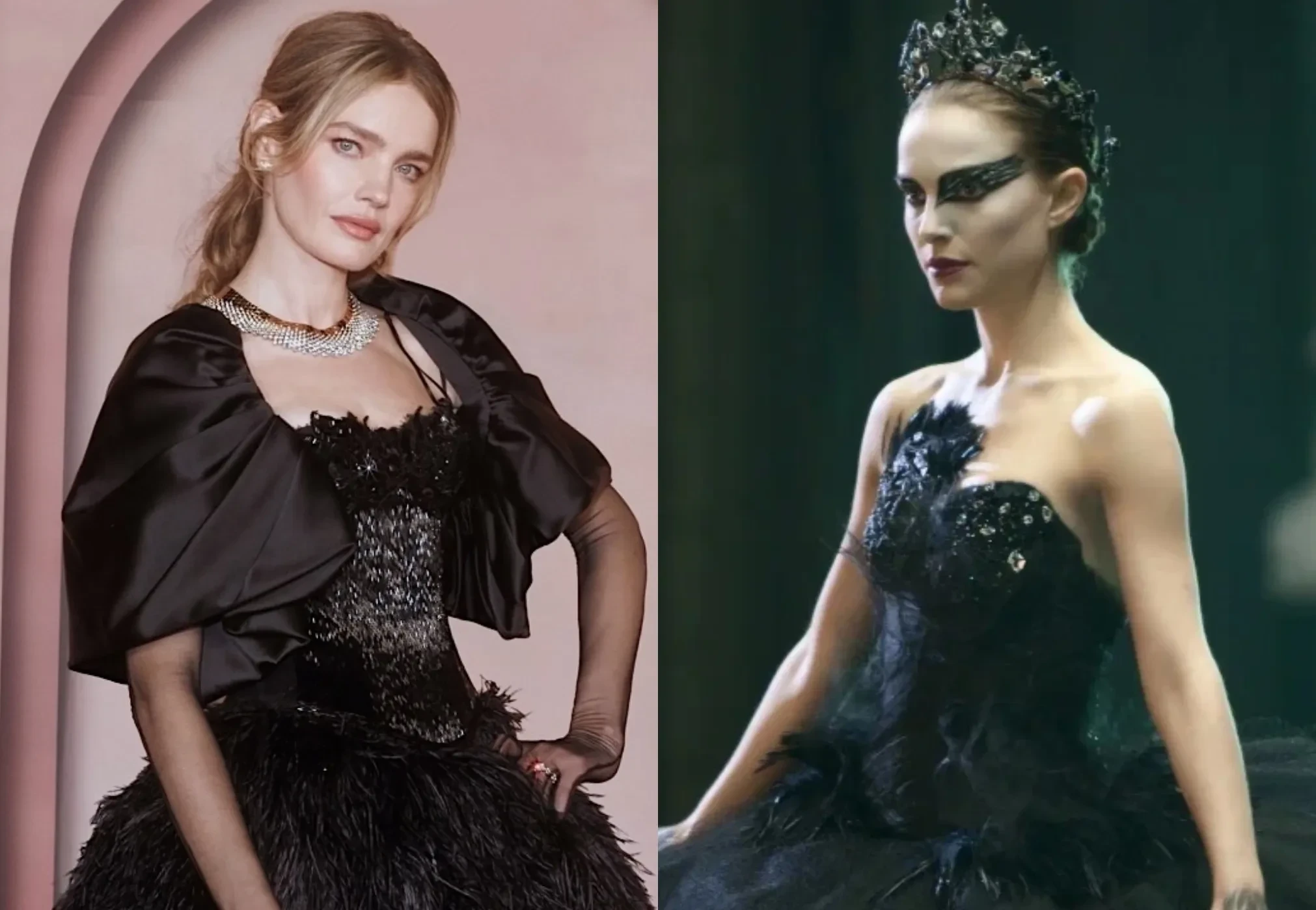 43-летняя супермодель вышла на дорожку в чёрном платье Dolce & Gabbana Alta-Moda с корсетом и объёмной юбкой с перьями из коллекции 2025 года. На создание образа стилиста Натальи Хьюго Тукаса Терзияна вдохновила героиня Натали Портман из фильма "Чёрный лебедь".
