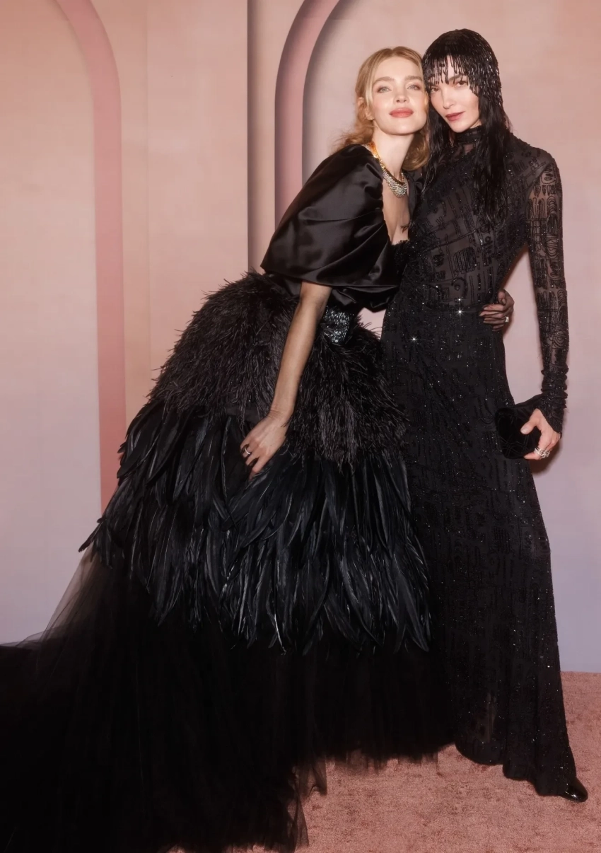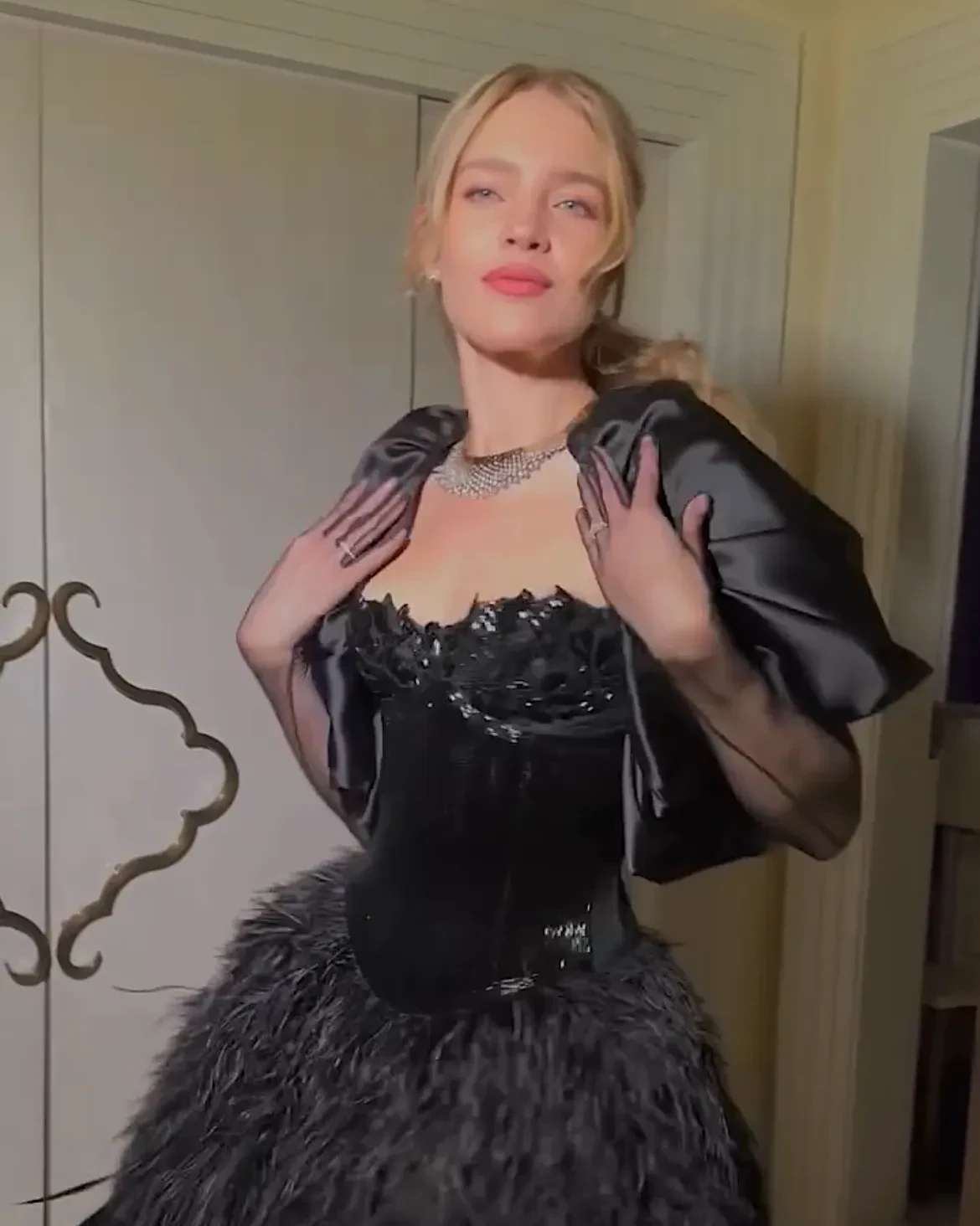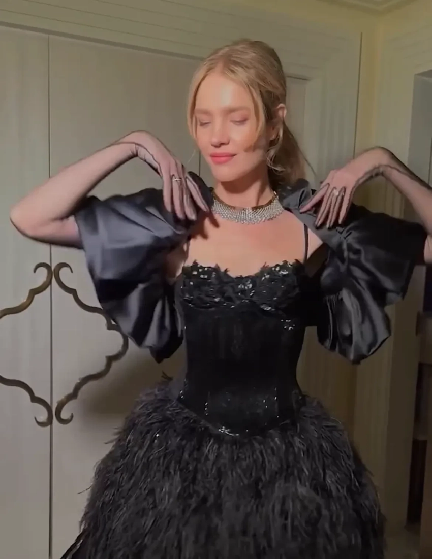 43-летняя супермодель вышла на дорожку в чёрном платье Dolce & Gabbana Alta-Moda с корсетом и объёмной юбкой с перьями из коллекции 2025 года. На создание образа стилиста Натальи Хьюго Тукаса Терзияна вдохновила героиня Натали Портман из фильма "Чёрный лебедь".