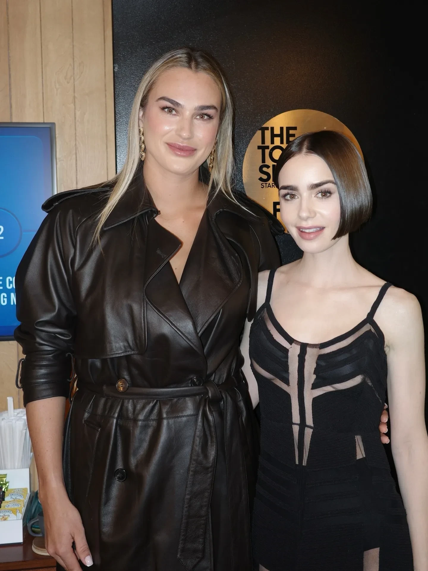 Для выхода в свет Соболенко выбрала чёрный кожаный тренч, который, судя по всему, надела на голое тело. Наряд дополнили массивные серьги, часы и туфли на шпильке. Кадры из студии и закулисные фотографии (в том числе с актрисой Лили Коллинз) спортсменка опубликовала в своём инстаграме**.