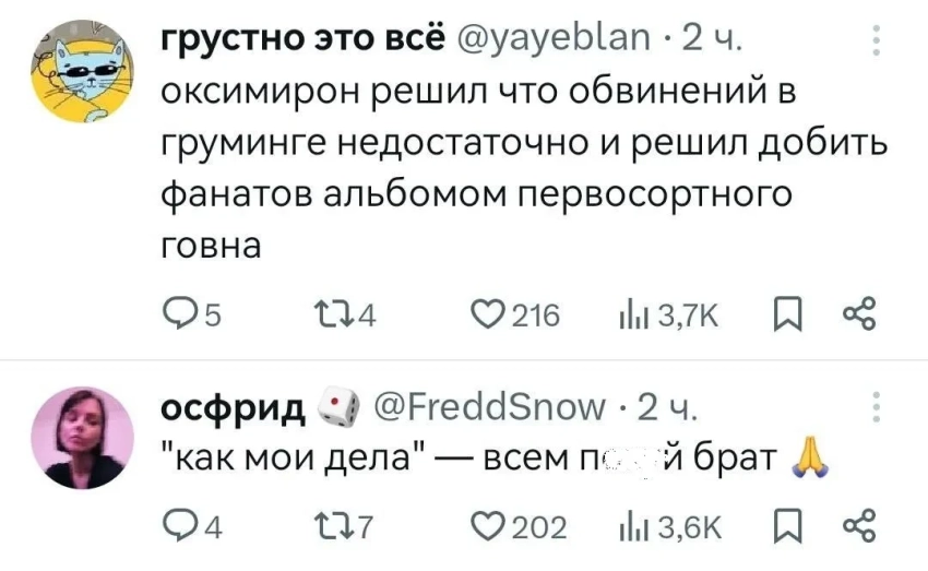 Оксимирон*Однако в соцсетях певца раскритиковали за такое возвращение в публичное пространство. Пользователи пишут, что после скандала не ждут от него новой музыки и иронизируют над словами из его треков.