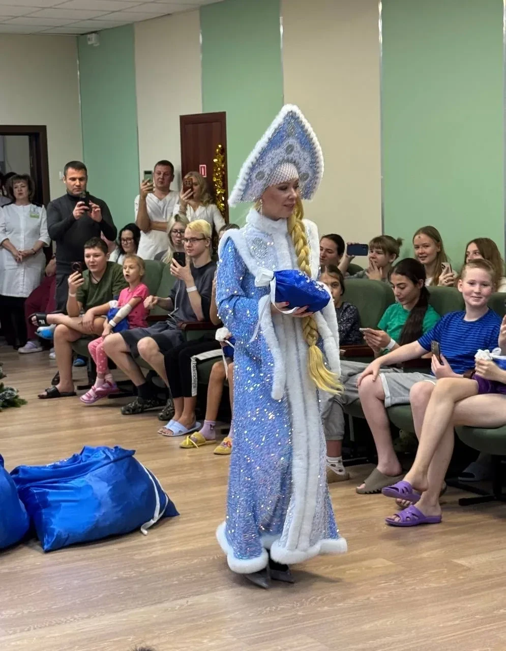 Пара, которая недавно сыграла свадьбу, пришла в образах Деда Мороза и Снегурочки и устроила для детей насыщенную программу: 34-летний певец и 41-летняя глава Лиги безопасного интернета пели с детьми новогодние песни, загадывали загадки и, конечно, подарили всем присутствующим подарки.
