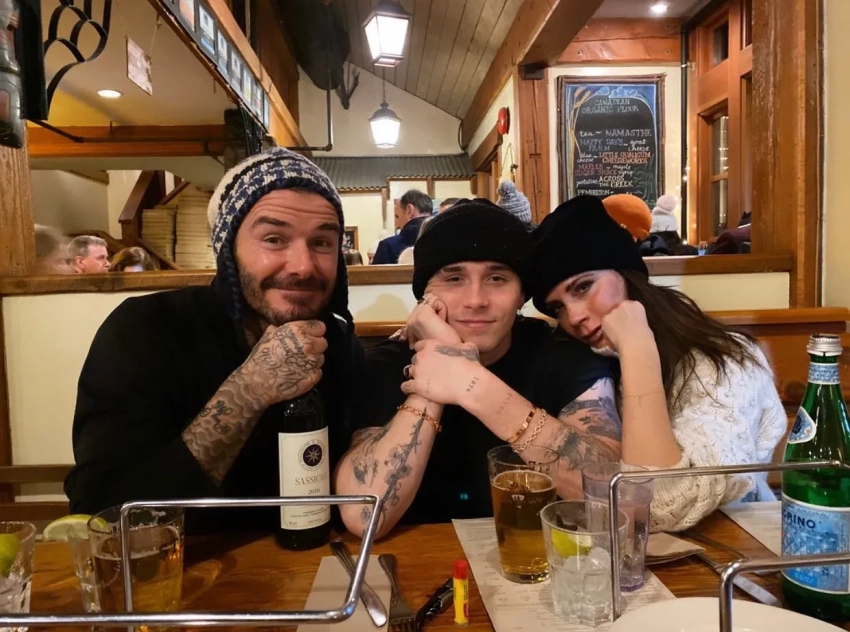 Дэвид, Бруклин и Виктория БекхэмОчевидно, Новый год и Рождество Бекхэмы встретили раздельно: Бруклин остался в США с женой и её родными, а Дэвид и Виктория отмечали праздник в Великобритании с младшими детьми.