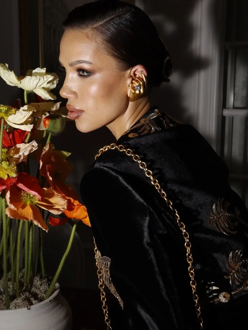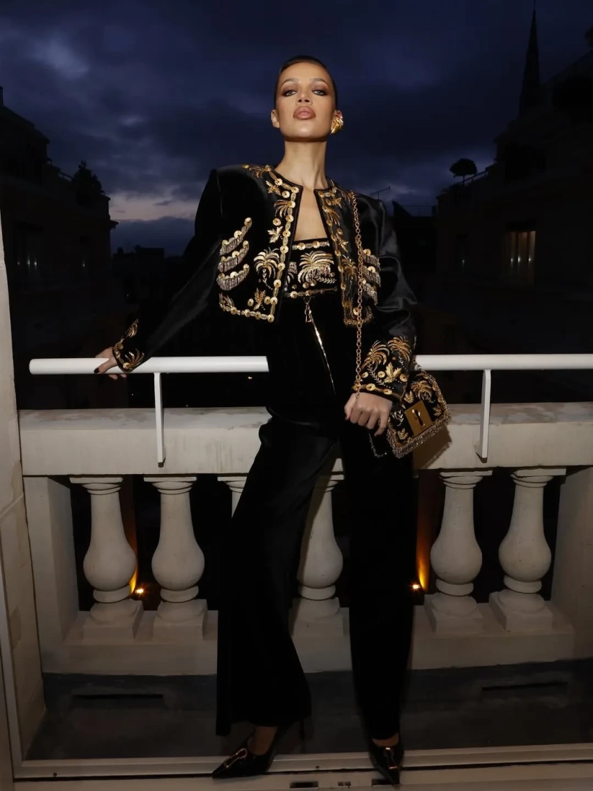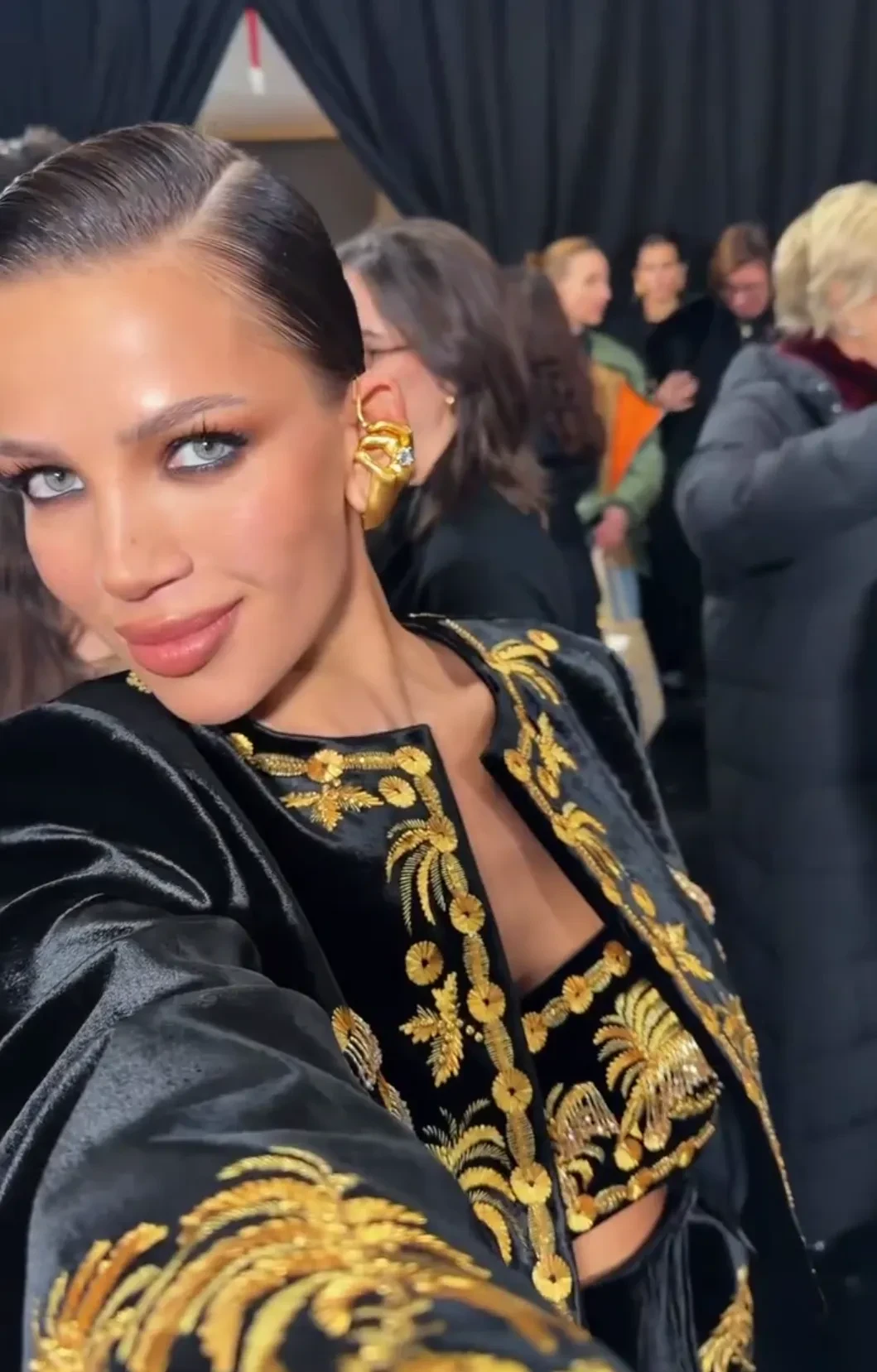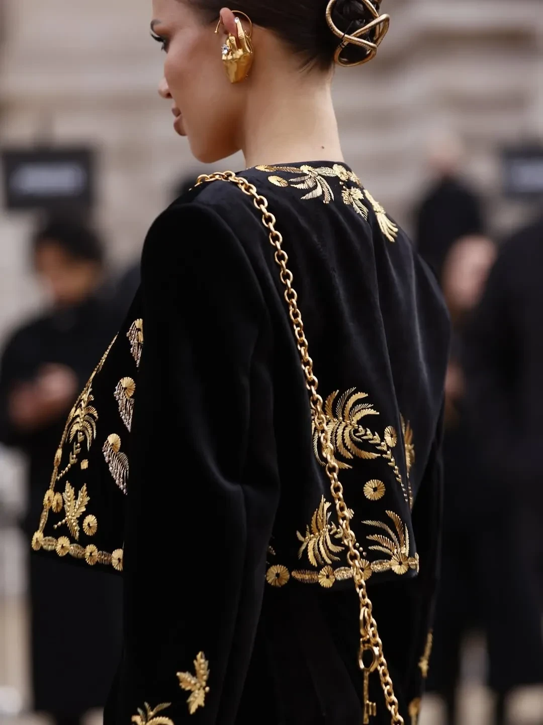 31-летняя Шевчук пришла на шоу в тотал-луке Schiaparelli: она надела брючный костюм из чёрного бархата с золотой вышивкой. Образ дополнили сумка в тон и золотая моносерьга. Жена бизнесмена прошла за кулисы после показа, где сфотографировалась с моделями и поправила макияж у легендарной визажистки Пэт Макграт.