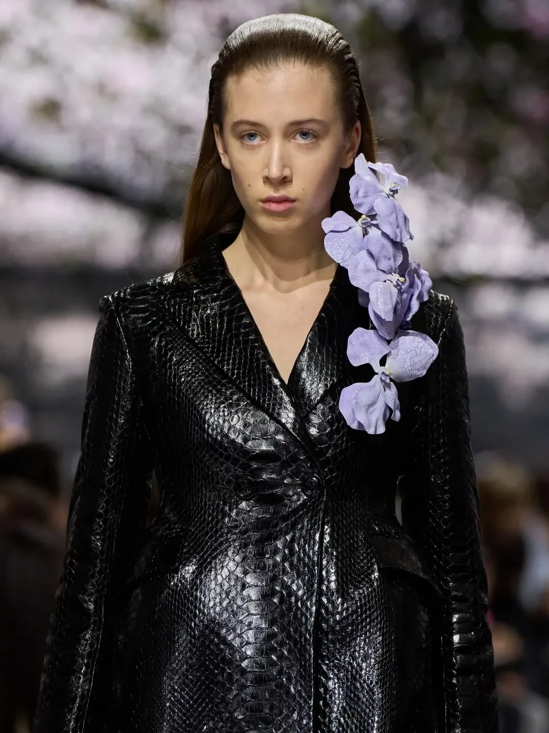 Сандэй Роуз появилась перед камерами в длинном чёрном пальто с текстурой под кожу крокодила, украшенном крупной сиреневой орхидеей на лацкане. Для показа она сменила цвет волос на более тёмный с красноватым оттенком.