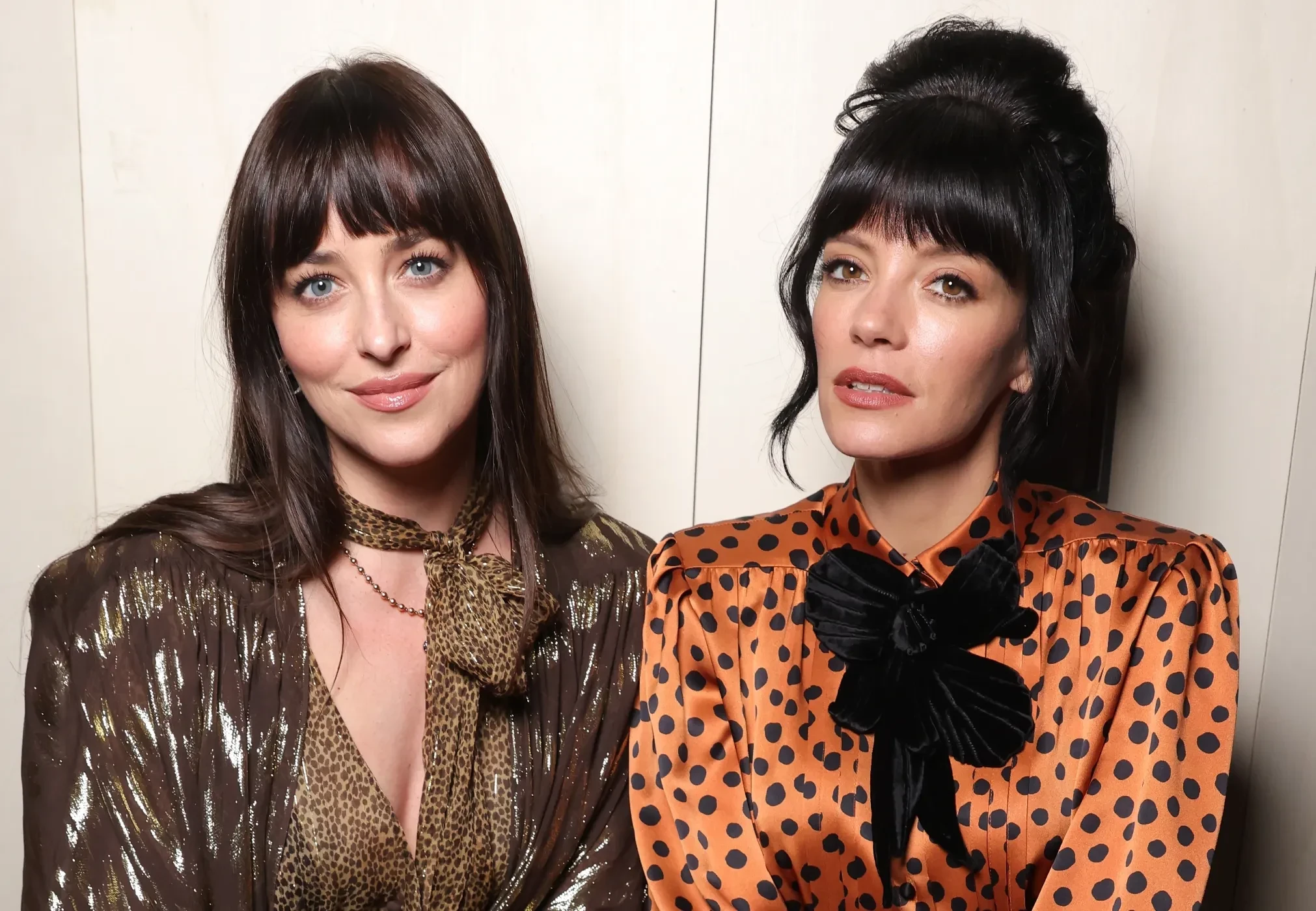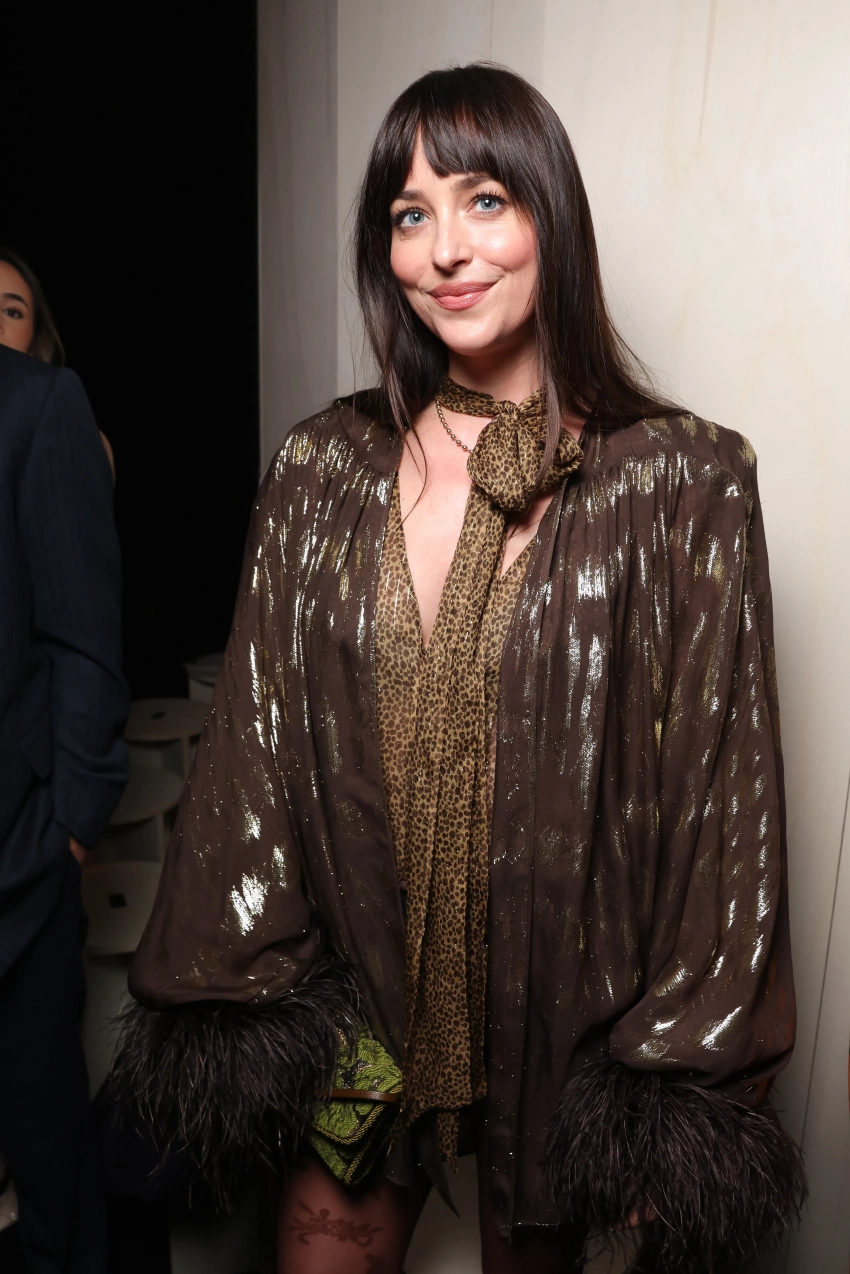 https://t.me/spletnik2006/4793536-летняя Дакота Джонсон, которая в прошлом году рассталась с фронтменом группы Coldplay Крисом Мартином, появилась в золотистой блузе с меховыми рукавами, леопардовом топе и микрошортах. 43-летняя Кирстен Данст позировала в голубом мини-платье с оборками и бантиками, а 40-летняя Лили Аллен, недавно начавшая встречаться с 28-летним праправнуком Зигмунда Фрейда, продемонстрировала оранжевую атласную рубашку в горошек с чёрным цветком-жабо и бархатную юбку миди глубокого зелёного цвета.