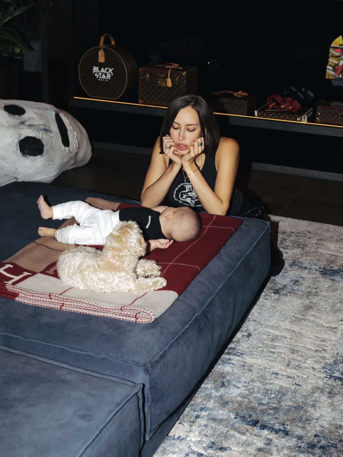 На фото Иванова в чёрной майке и кожаных штанах позирует в обнимку с пятимесячной девочкой у себя дома. На некоторых кадрах к ним также присоединяется питомец Валентины, собачка породы мальтипу по кличке Киви. "Мой дом там, где есть вы", — подписала публикацию модель.