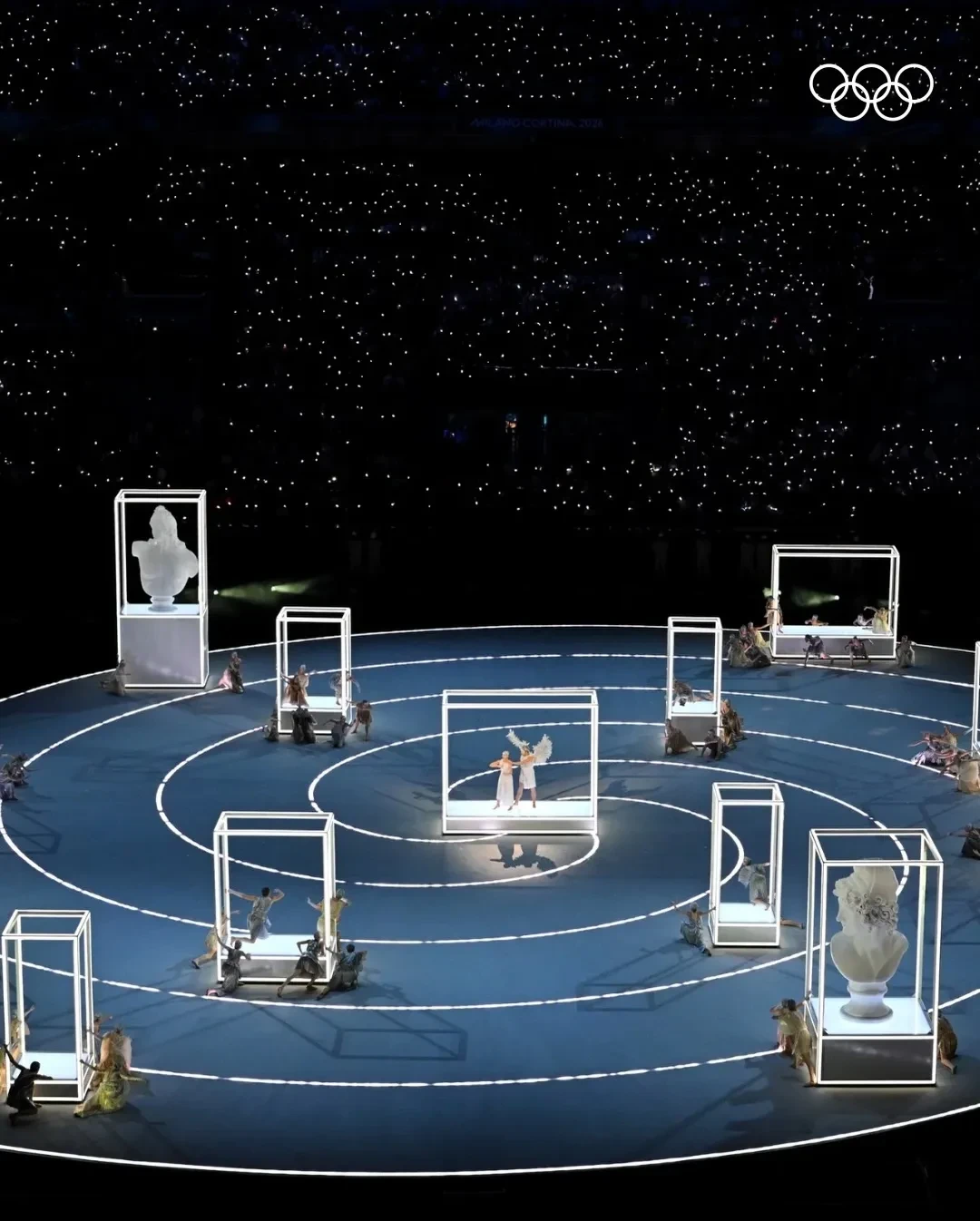 За номера в этот раз отвечал Марко Балич, создавший уже более десяти олимпийских церемоний. Шоу, которое уже называют "величайшим в истории", получило название Armonia ("Гармония") и символизировало единство города и гор, технологий и человечества. Масштабное зрелище было целиком посвящено итальянской культуре, а в живых выступлениях приняли участие более 1200 волонтёров. В рамках программы почтили наследие великого скульптора Антонио Кановы, воссоздав с помощью декораций и актёров античный миф о Купидоне и Психее, а также вспомнили трёх великих итальянских композиторов — Россини, Верди и Пуччини, которым "дирижировала" актриса Матильда де Анджелис.