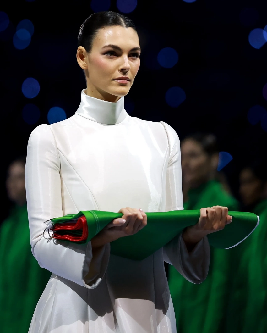 Отдельный блок организаторы посвятили памяти культового итальянского дизайнера Джорджо Армани, скончавшегося осенью прошлого года. На стадионе прошло настоящее дефиле в его нарядах зелёных, белых и красных цветов. При этом позади моделей торжественно вышагивала не кто иная, как возлюбленная Леонардо ДиКаприо Виттория Черетти, которой выпала честь нести национальный флаг. 27-летняя топ-модель была одета в эксклюзивное платье от Armani Privé, напоминающее наряд Карлы Бруни. Последняя 20 лет назад удостоилась этой же привилегии на зимних Олимпийских играх в Турине.