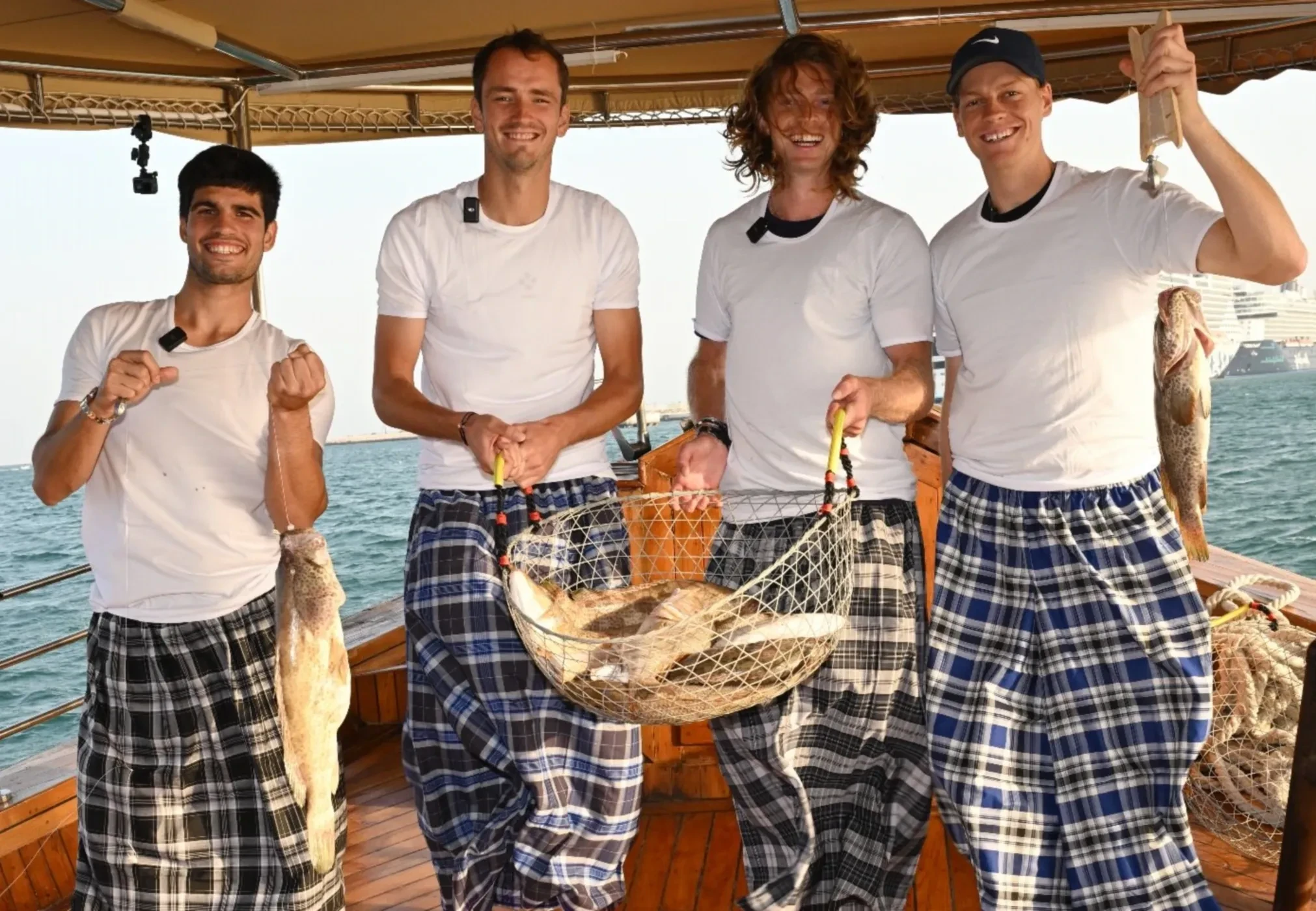 Перед тем как спортсменам провели инструктаж, они облачились в одинаковые наряды из белых футболок и клетчатых фут (мужская юбка, распространённая в арабских странах. — Прим. ред.). В противовес страстям на корте, улов удался у всех. "Это не ИИ, а просто парни, которые рыбачат в старом добром катарском стиле", — с юмором подписали организаторы пост.