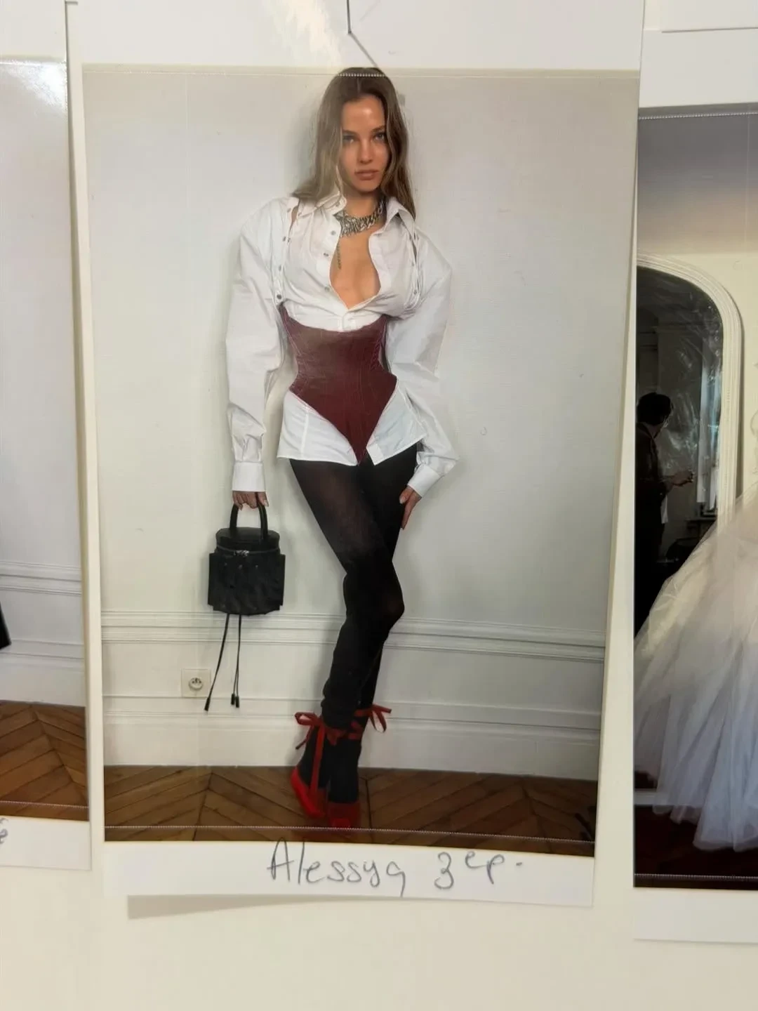 Кафельникова вышла на подиум в белой рубашке с декольте, колготках и розовом корсете. Также она примерила корсет из прозрачной ткани с юбкой, красные джинсы с бомбером и показала закулисье шоу.