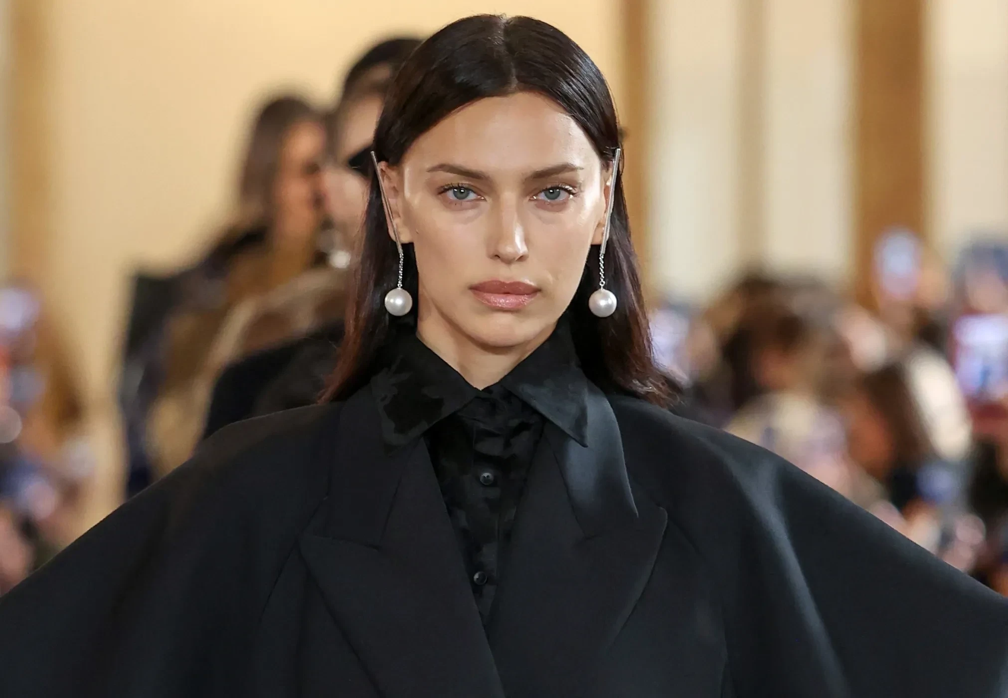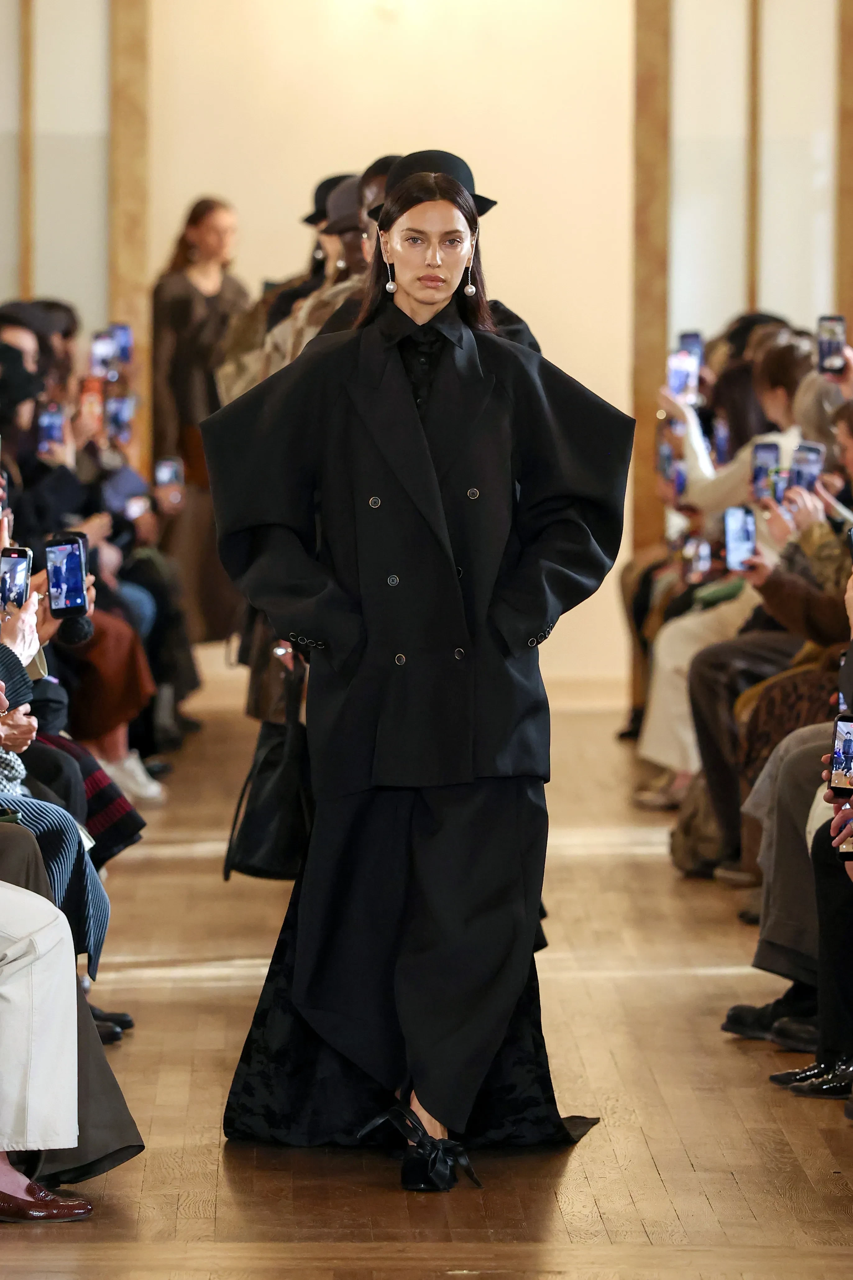 Ирина Шейк вышла на подиум на показе Uma Wang, который состоялся в рамках Недели моды в Париже. 40-летняя модель дефилировала в total black образе: на ней был жакет с объёмными рукавами, чёрная рубашка и макси-юбка. Завершали наряд балетки с бантами и фактурные серьги с белыми бусинами.