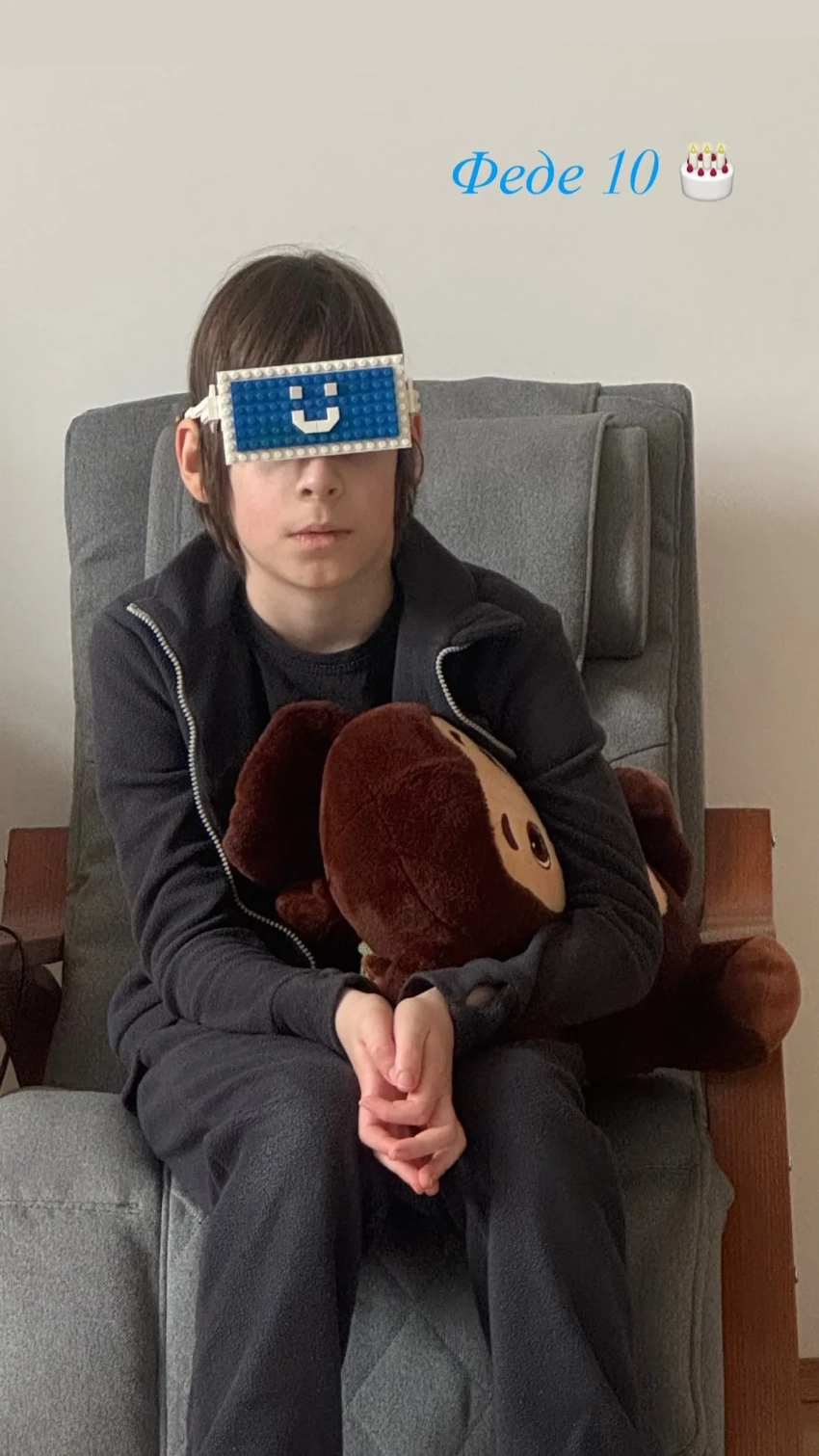 Фото Юлии Снигирь (Фёдор по центру)Евгений был ещё более краток. Он запостил снимок Фёдора в импровизированных очках из конструктора Lego, подписав его: "Феде 10".
