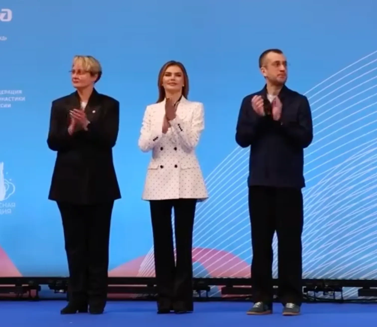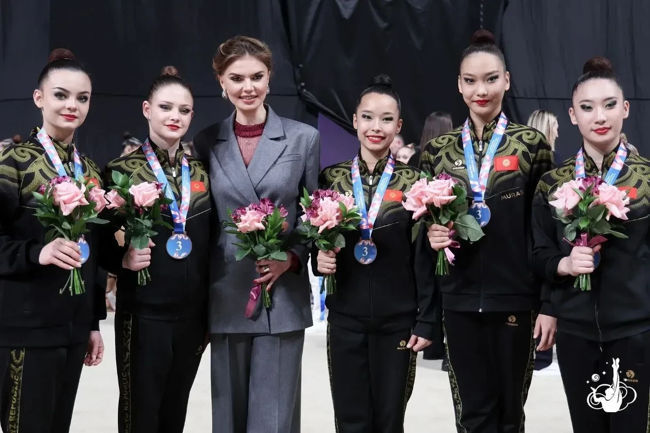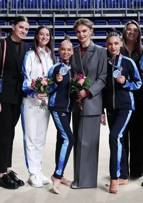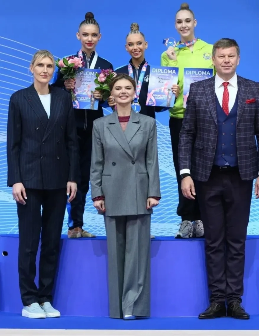 42-летняя Кабаева появилась на турнире в сером брючном костюме, который она надела с полупрозрачной бордовой блузкой, а в другой день она блистала в белом жакете в горошек. Спортсменка фотографировалась с участницами турнира и воспитанницами своей академии "Небесная грация" и поддерживала их.