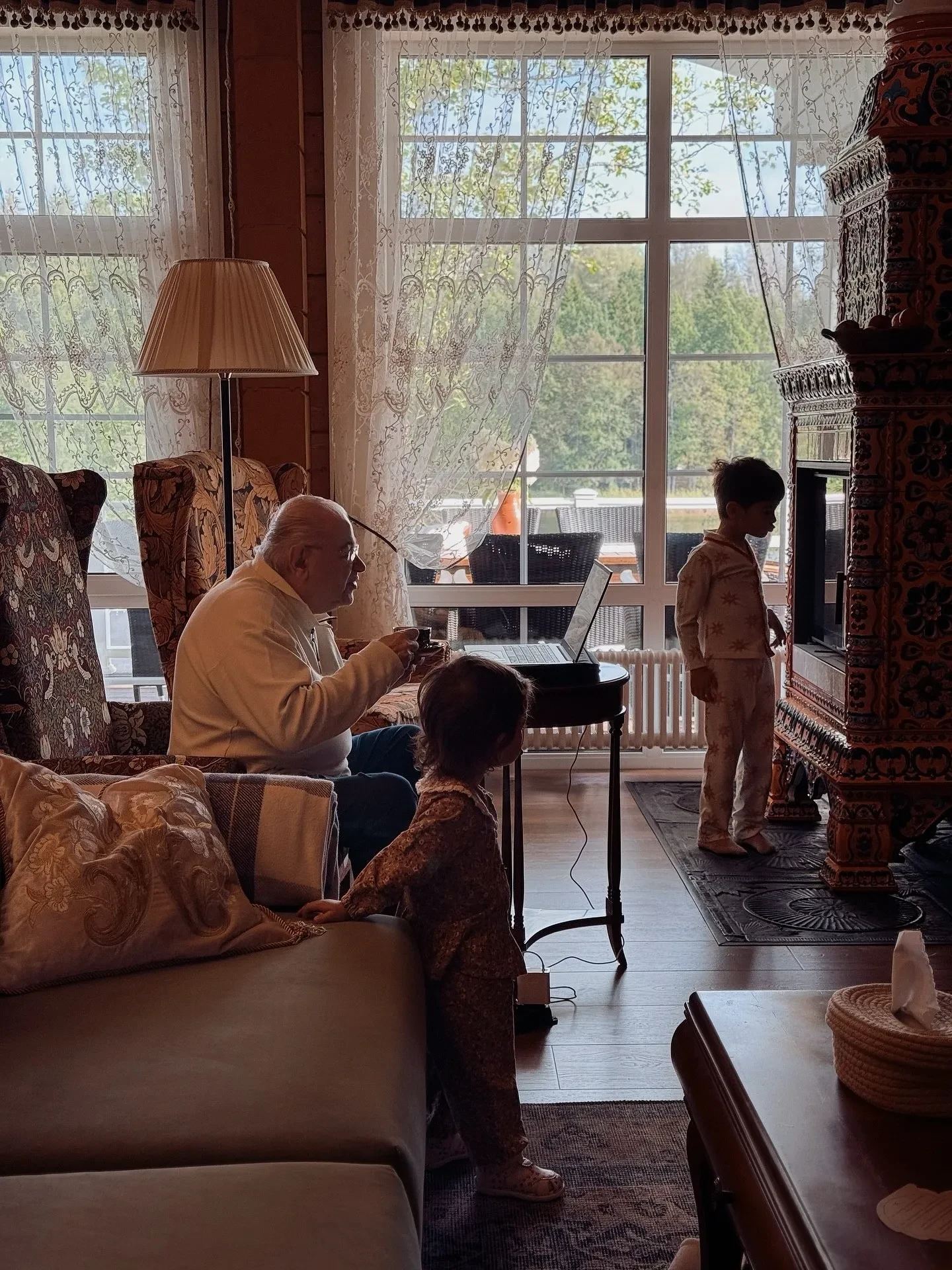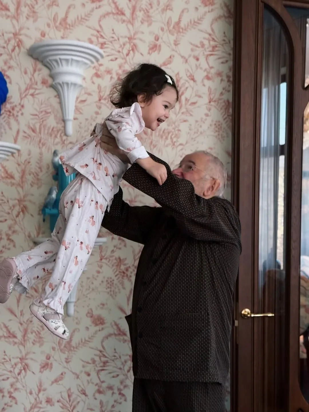 В кадре двухлетняя Матильда, одетая в светлую пижаму, смеётся на руках у 80-летнего отца, который тоже предстал в расслабленном виде — в домашнем костюме коричневого цвета.