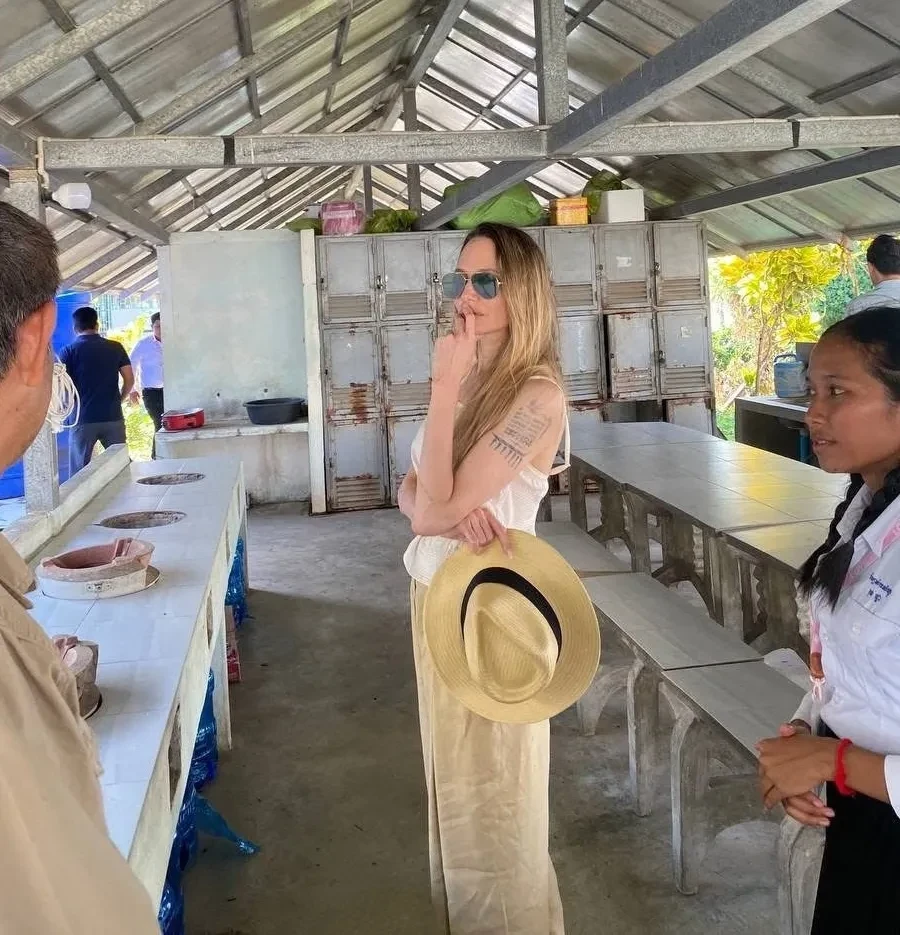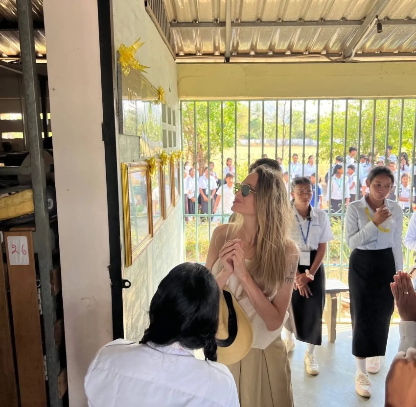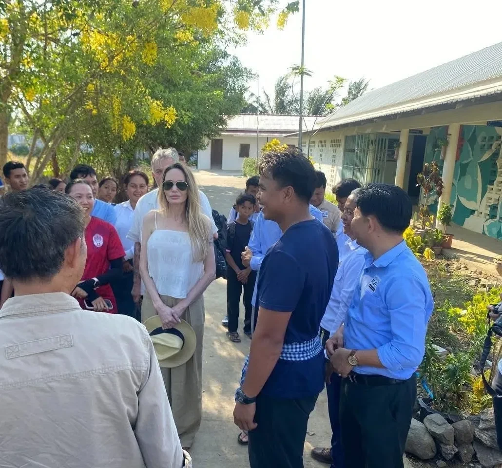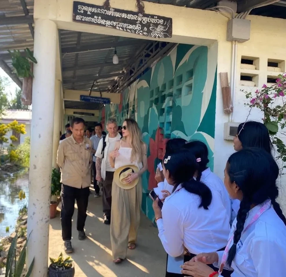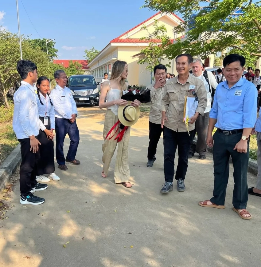 Джоли появилась на публике в белом топе, широких брюках и солнцезащитных очках. В ходе своего визита она ознакомилась с учебным процессом учеников и ходом строительства общежития для них. О приезде кинозвезды сообщило Министерство образования Камбоджи.