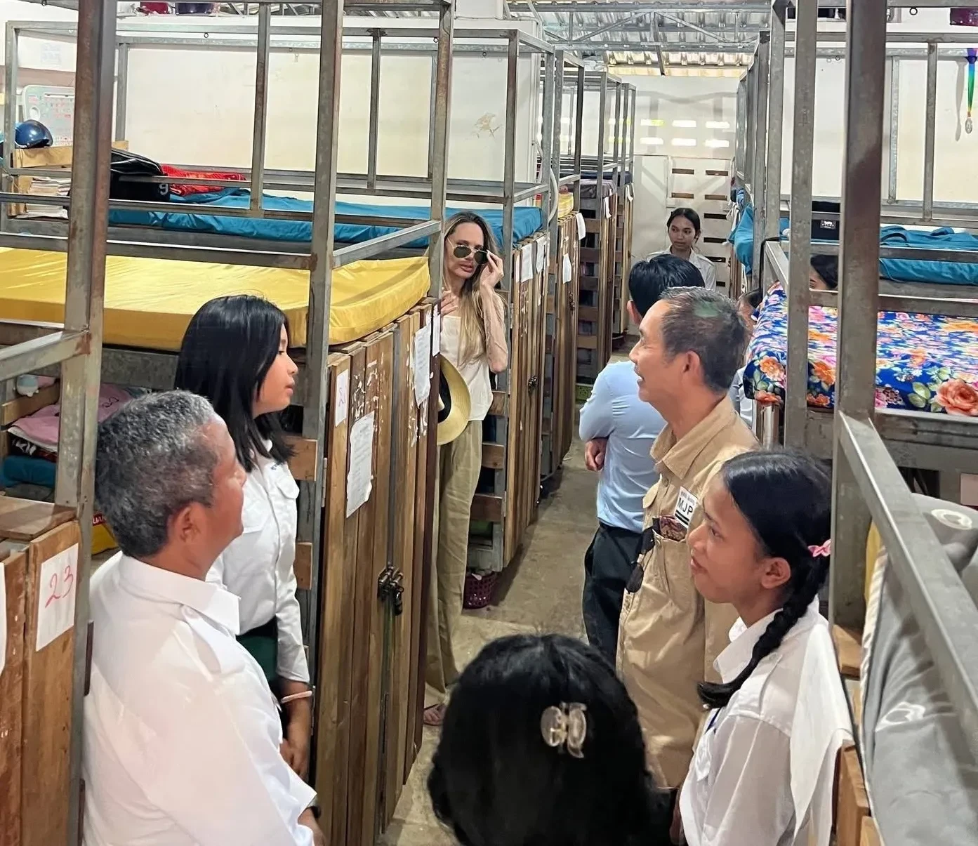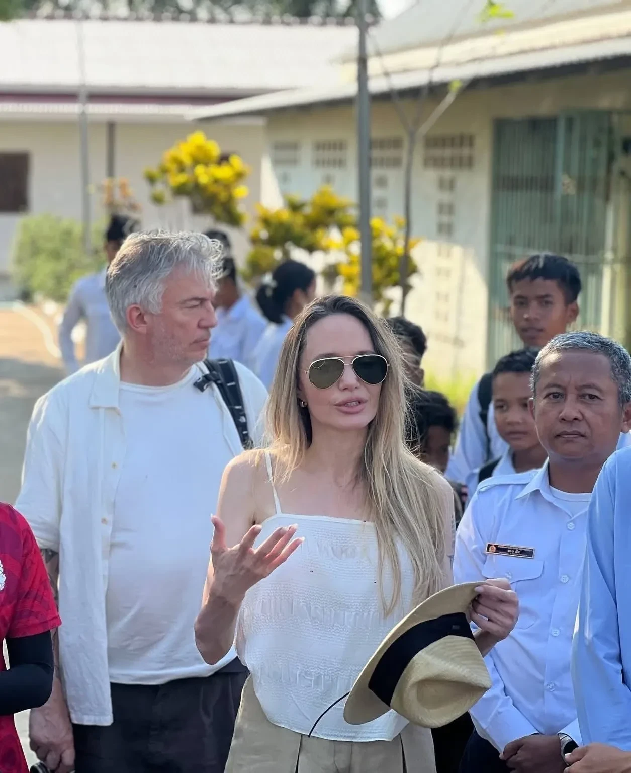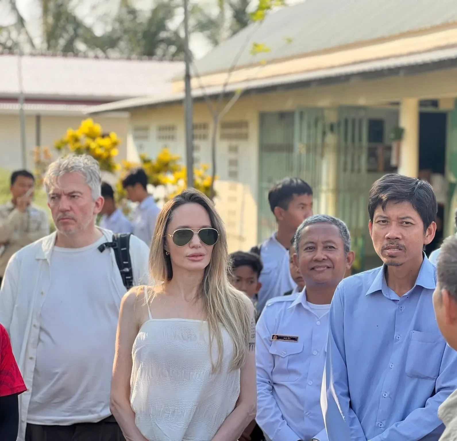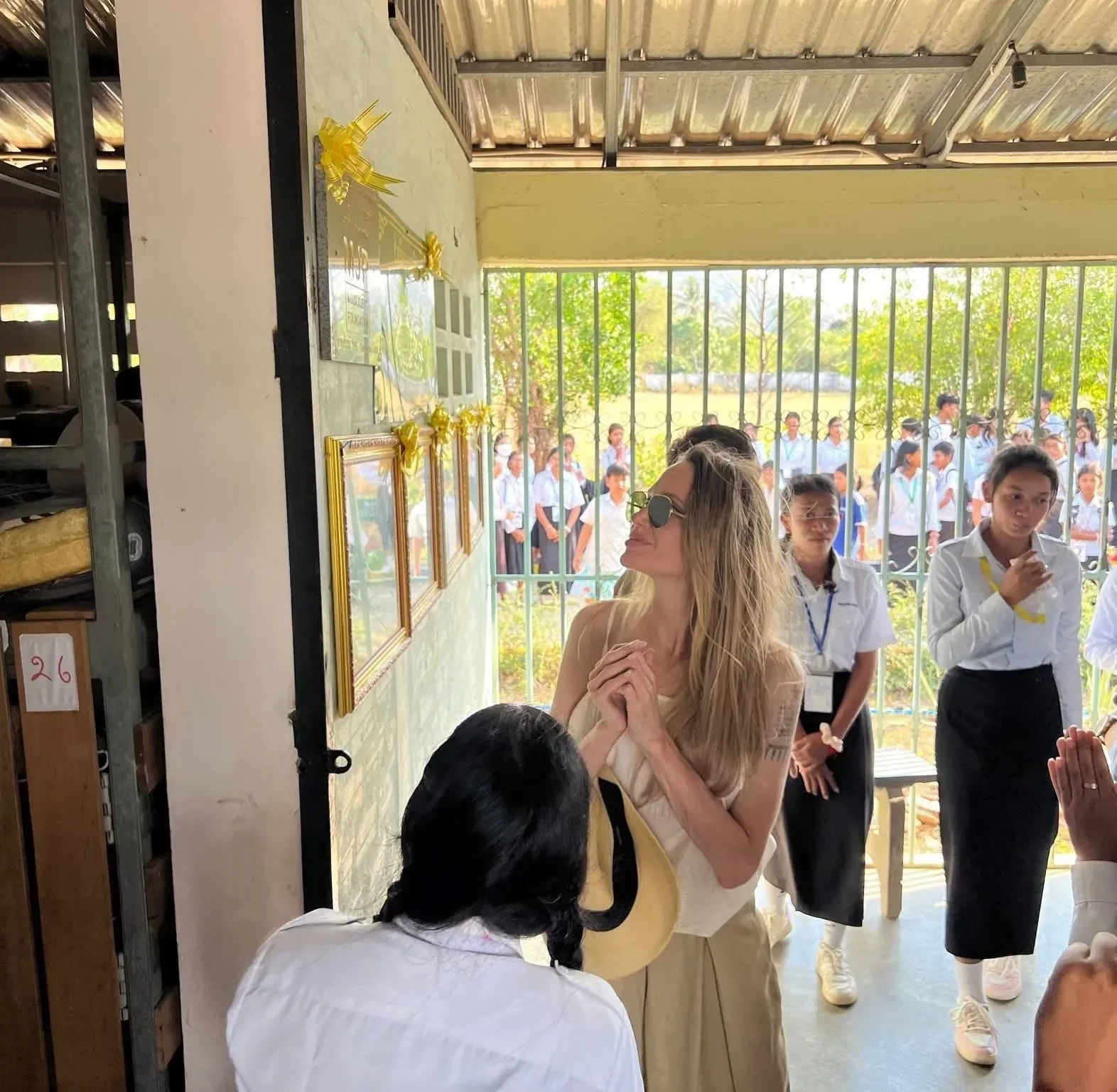 Джоли появилась на публике в белом топе, широких брюках и солнцезащитных очках. В ходе своего визита она ознакомилась с учебным процессом учеников и ходом строительства общежития для них. О приезде кинозвезды сообщило Министерство образования Камбоджи.