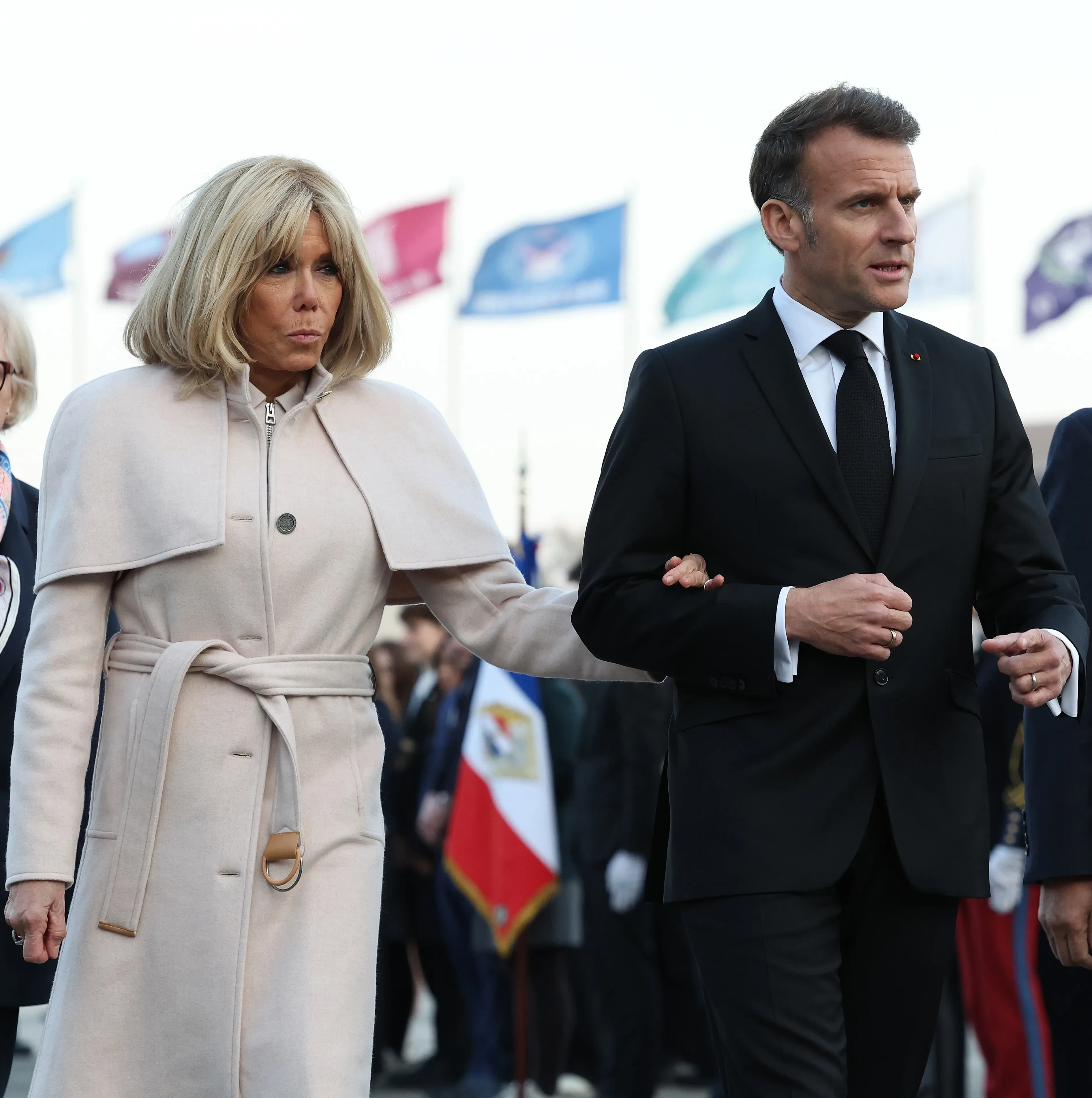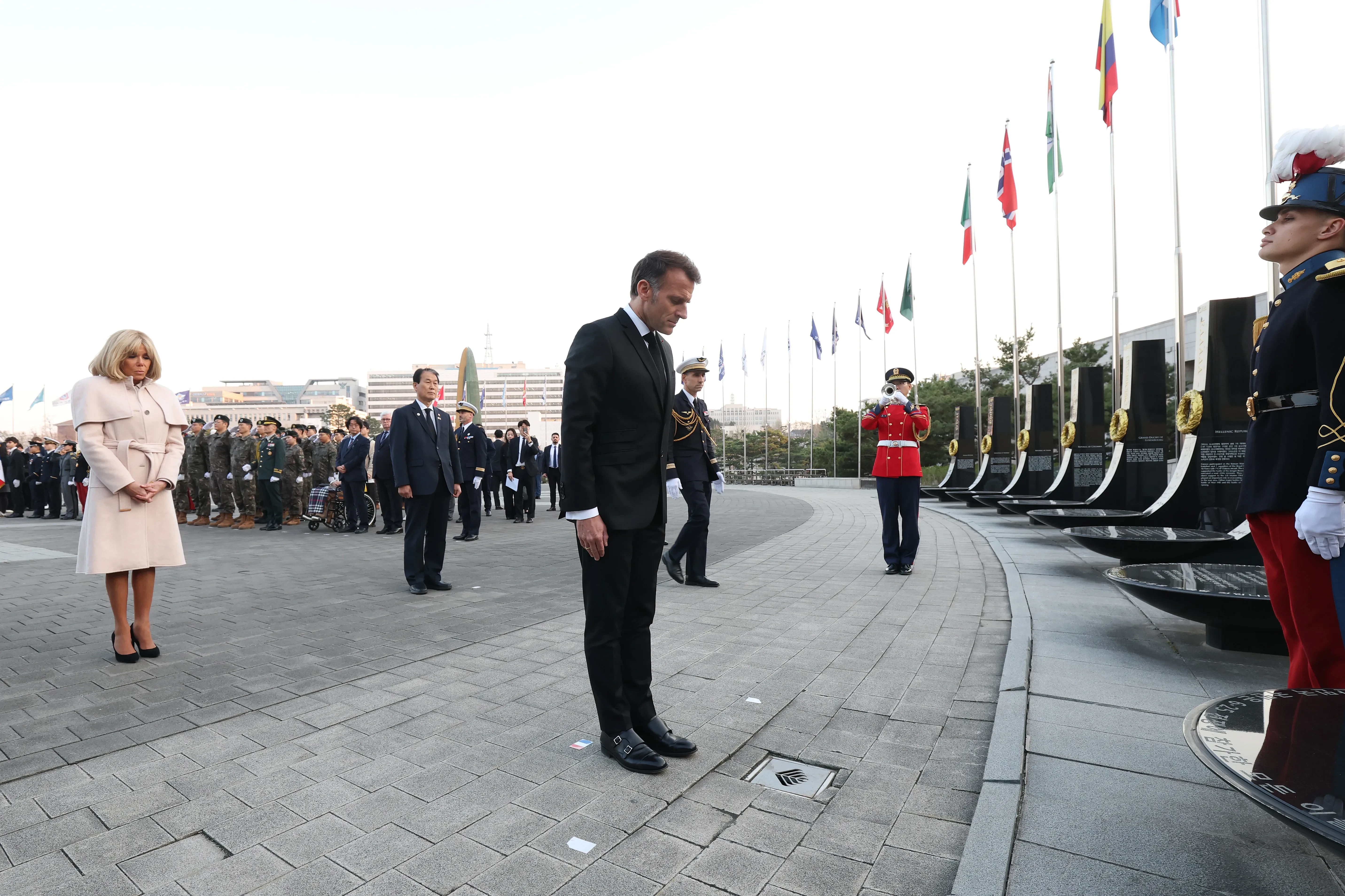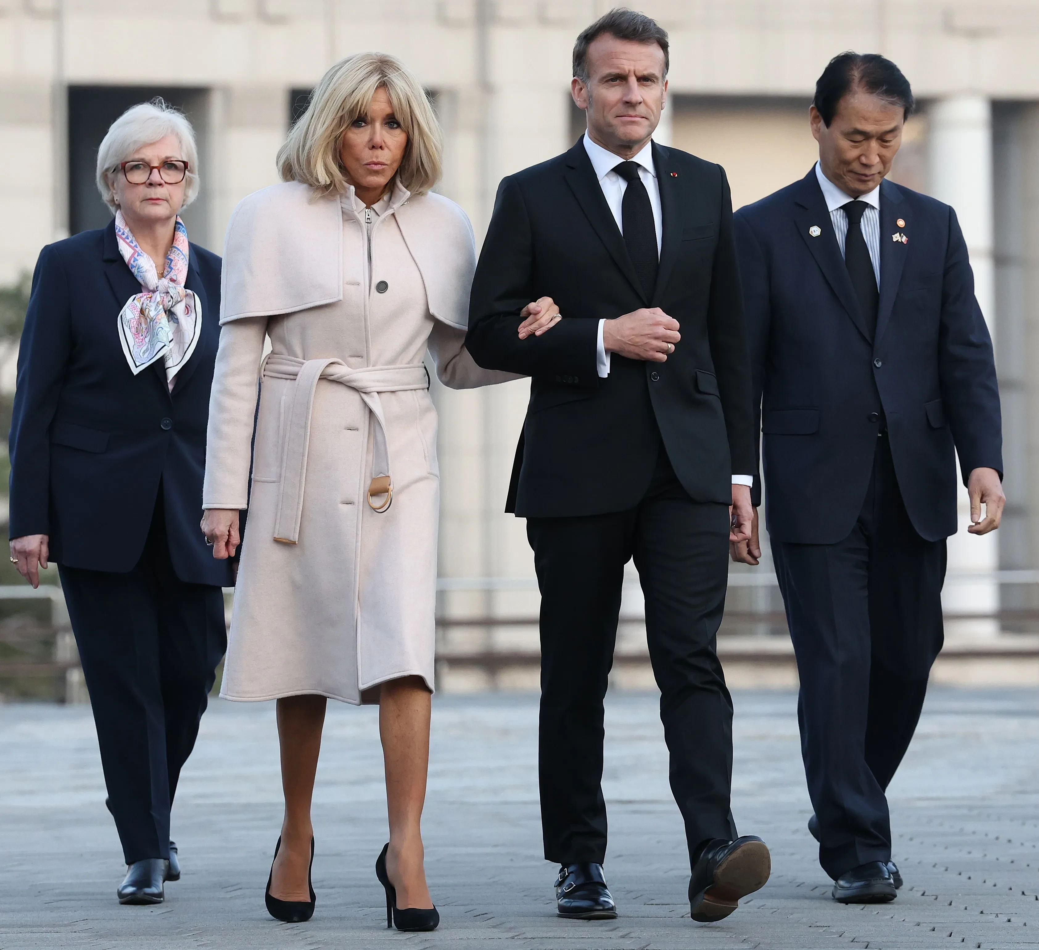 Эммануэль и Брижит Макрон, император Нарухито и императрица МасакоПосле визита в Японию Эммануэль и Брижит Макрон отправились в Сеул. Там они посетили мемориал павшим в Корейской войне. Супруга президента появилась на публике в белом пальто и туфлях на каблуках.
