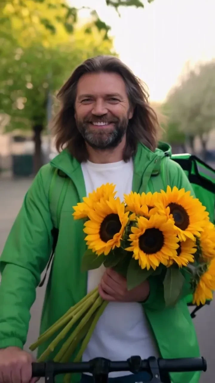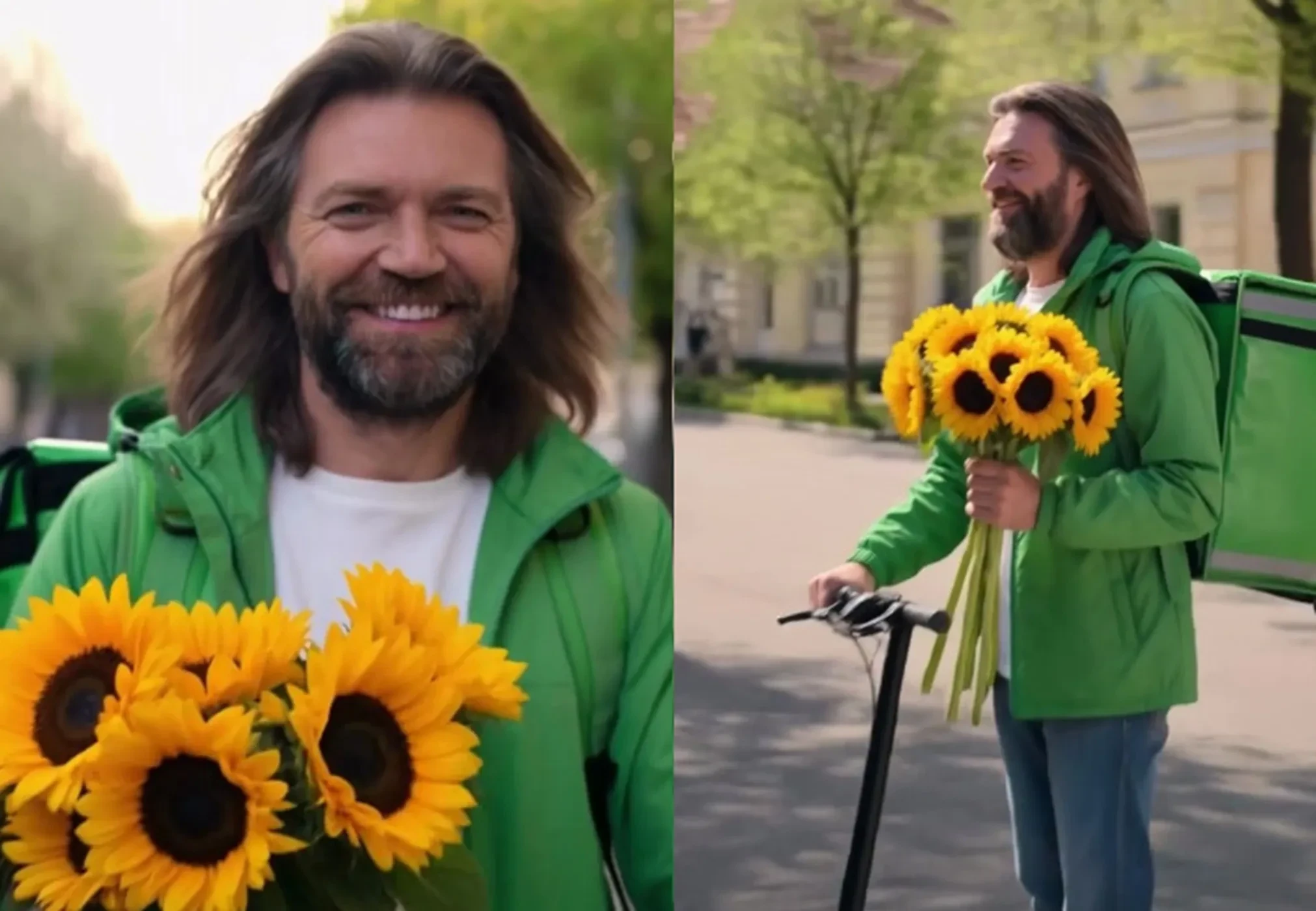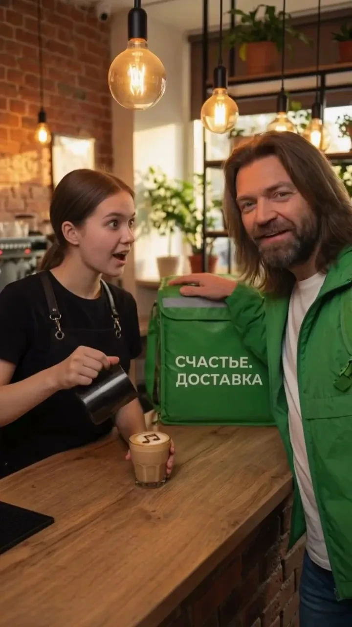 В ролике (по всей видимости, сделанном частично с использованием нейросетей) 56-летний певец предстал с густой бородой и в образе курьера на самокате, который "доставляет счастье".