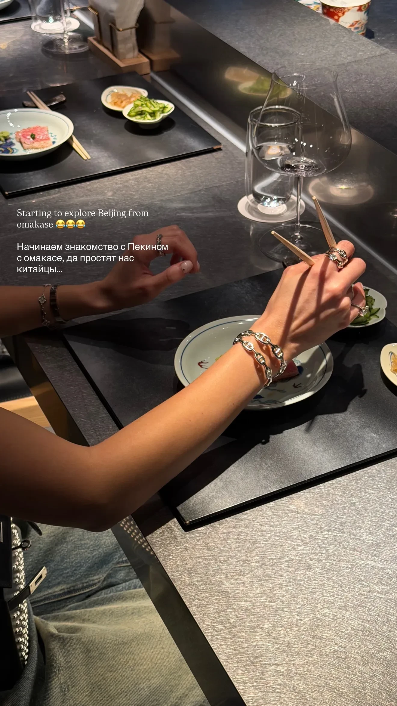 Пара остановилась в Шанхае. Здесь, в компании друзей, она исследует достопримечательности, любуется цветением сакуры, знакомится с местной кухней и, конечно же, заглядывает во все люксовые бутики.