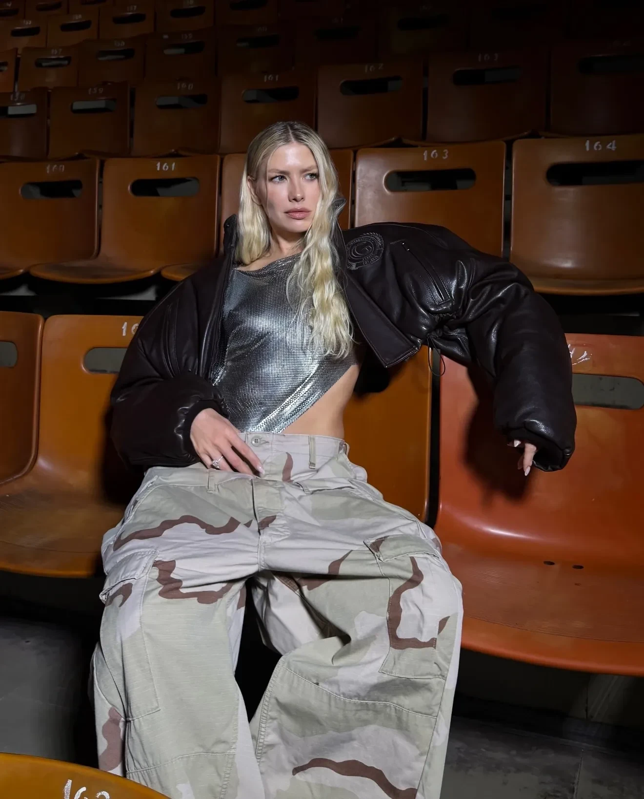 Перминова посетила показ "Яндекс Маркета" в камуфляжных брюках, серебристом топе и косухе. Из украшений на ней было только кольцо, похожее на помолвочное, которое она не скрывала, а, будто наоборот, активно демонстрировала публике.