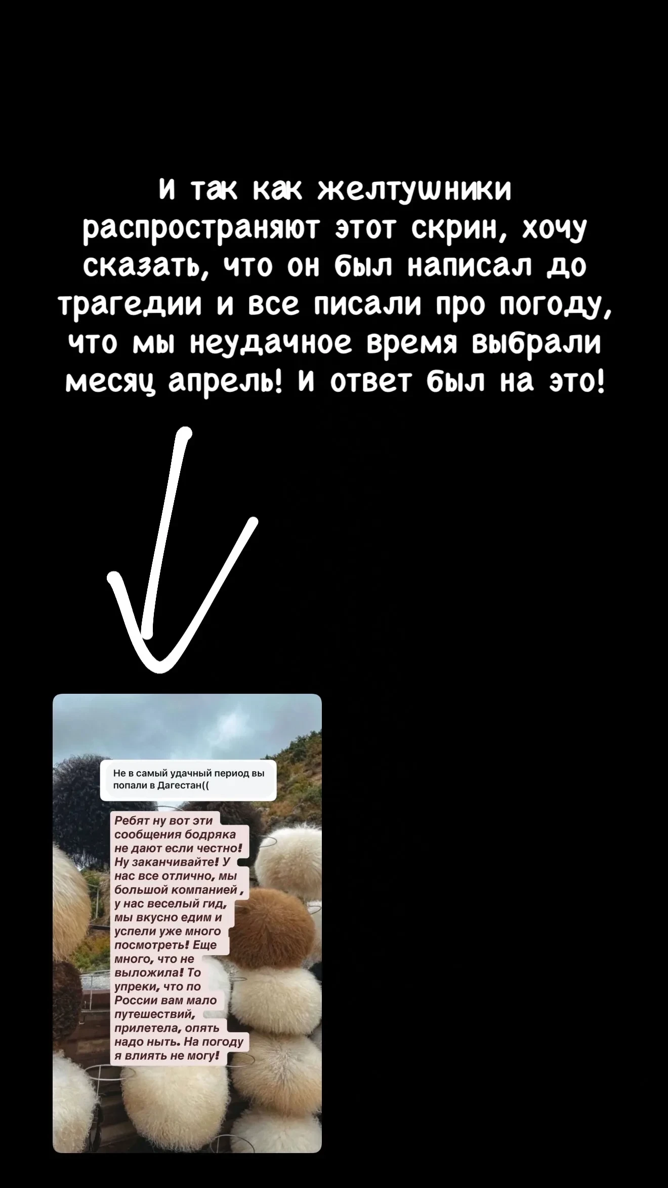 Пост Иды ГаличК помощи подключилась и Виктория Боня, также пожертвовав значительную сумму от себя и своего бренда. Она назвала происходящее "очень тяжёлой ситуацией" и призвала людей проявить солидарность. По её словам, дагестанцы не раз помогали другим — в том числе "участвовали в сборах для больных русских детей", — и теперь важно поддержать их в ответ.