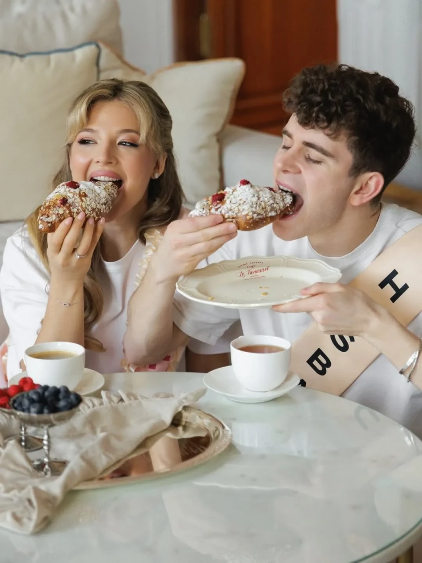 Судя по снимкам, своё первое совместное утро в качестве молодожёнов Артур и Аня встретили в постели в отеле, где им сервировали минималистичный завтрак: кофе, чай, круассаны и свежие ягоды.