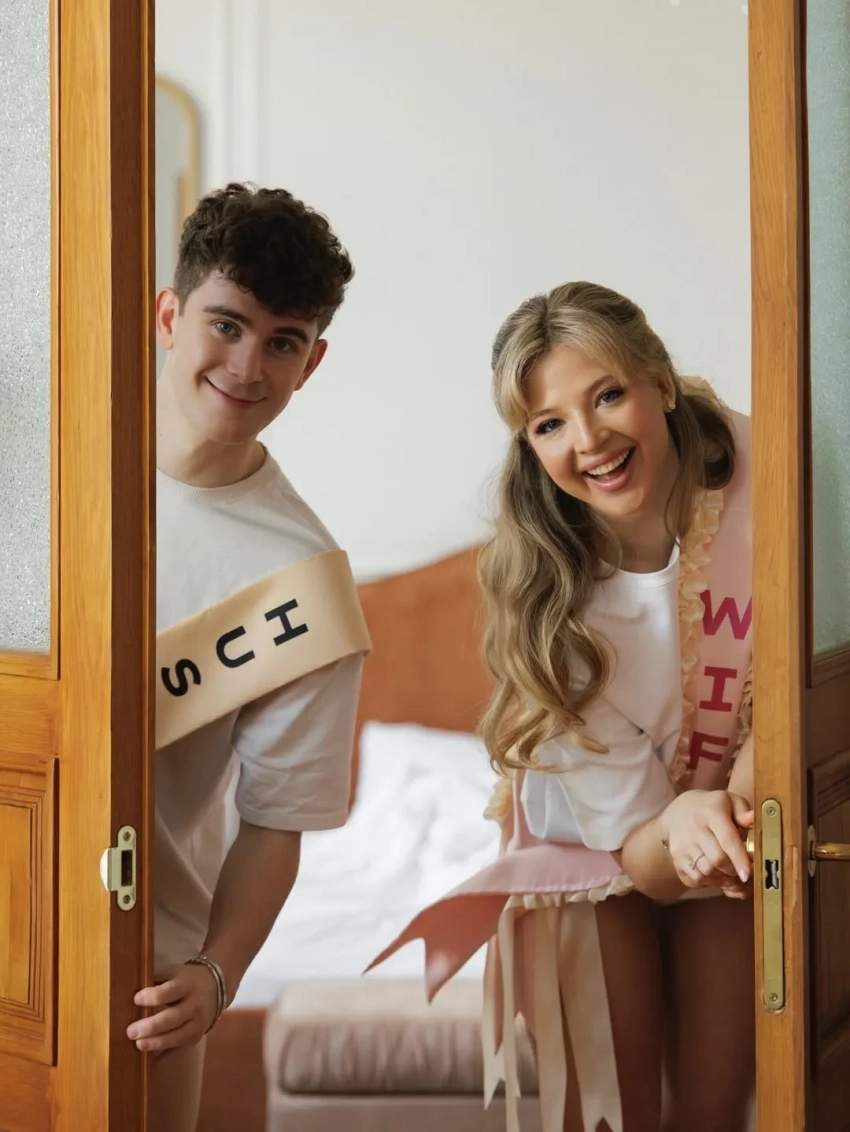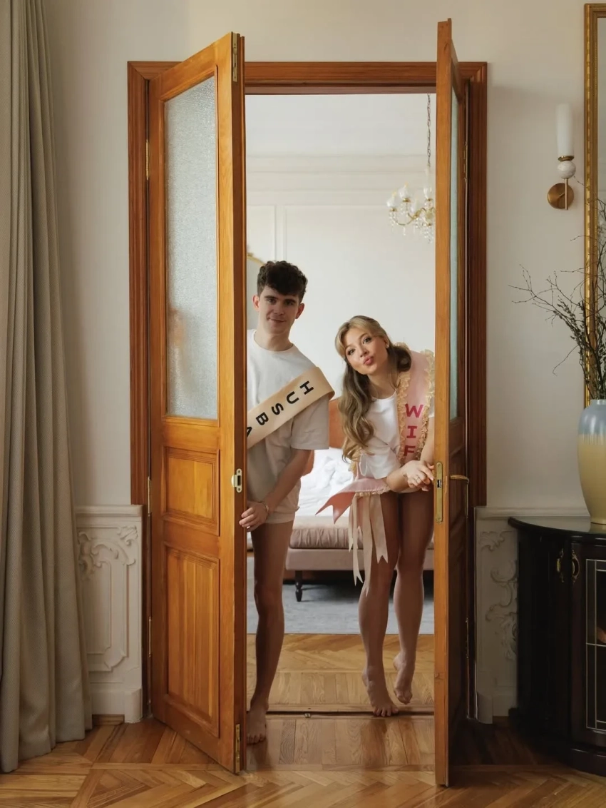 Блогеры Аня Покров и Артур Бабич, которые поженились 6 апреля, на следующее утро выложили в инстаграме* необычную фотосессию. Вместо более праздничных нарядов молодожёны выбрали простые футболки и ленты с надписями "муж" и "жена".