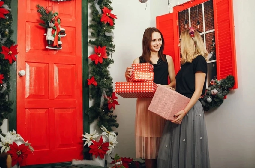 Если в доме есть лестница — обвесь её мишурой и хвойными ветвями. А на двери можно повесить новогодние носки с маленькими сюрпризами — символ семейного тепла.
