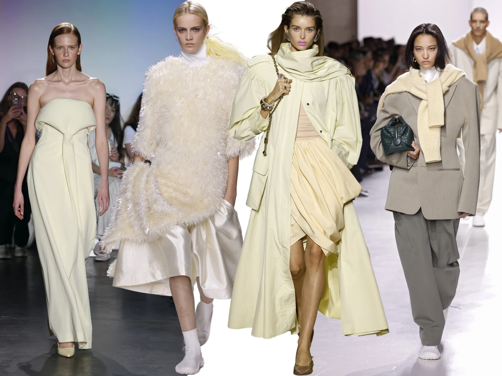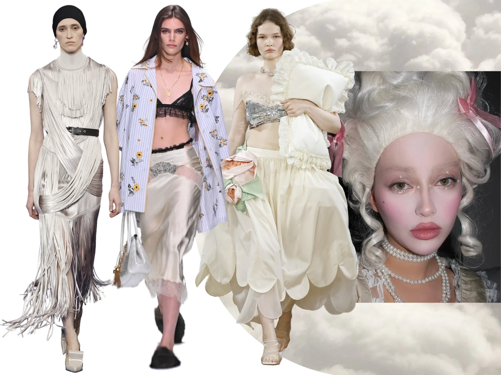 Кружево, атлас, оборки и фасон «баллон» продолжают покорять подиумы. Бельевой стиль и эстетика Марии-Антуанетты, превратившаяся в coquette core, вдохновляет дизайнеров на шелковые миди-юбки, платья-комбинации и топы-бра. Lanvin, Dolce&Gabbana и Simone Rocha предлагают сочетать будуарную эстетику с наивными аксессуарами, создавая легкий романтический образ.