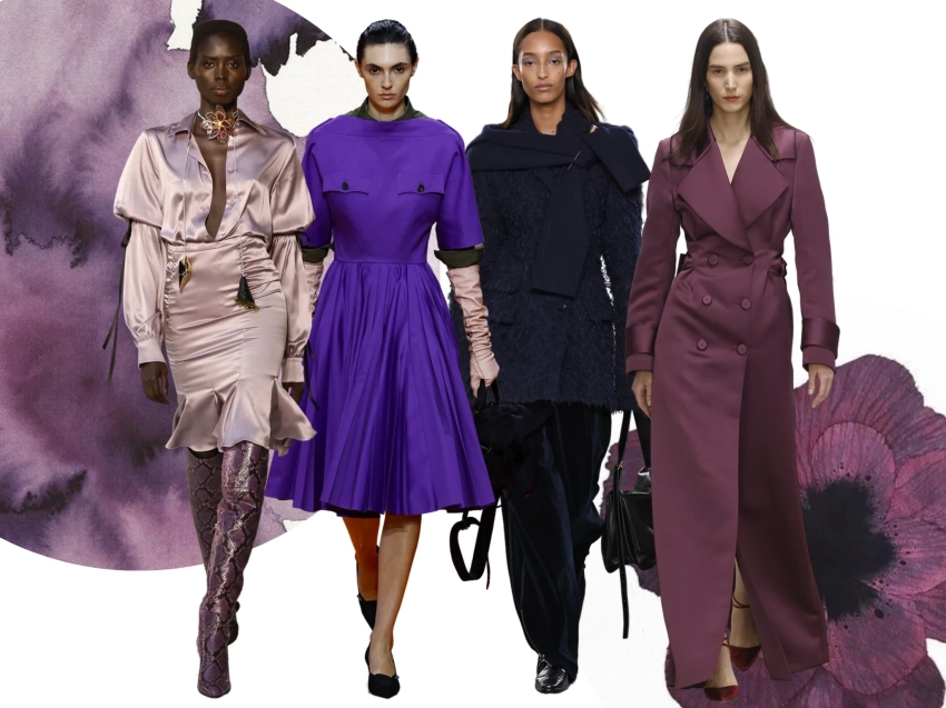 Кремово-желтый, Popcorn Yellow и Vanilla Yellow — самые востребованные оттенки сезона, особенно в свитерах, маечках и полупрозрачных летних платьях. Фиолетовые оттенки — пурпурные, сливовые, лавандовые и баклажановые — гармонично сочетаются с кремовым, лаймовым и нежно-розовым, а также используются в аксессуарах и нейтральных образах.