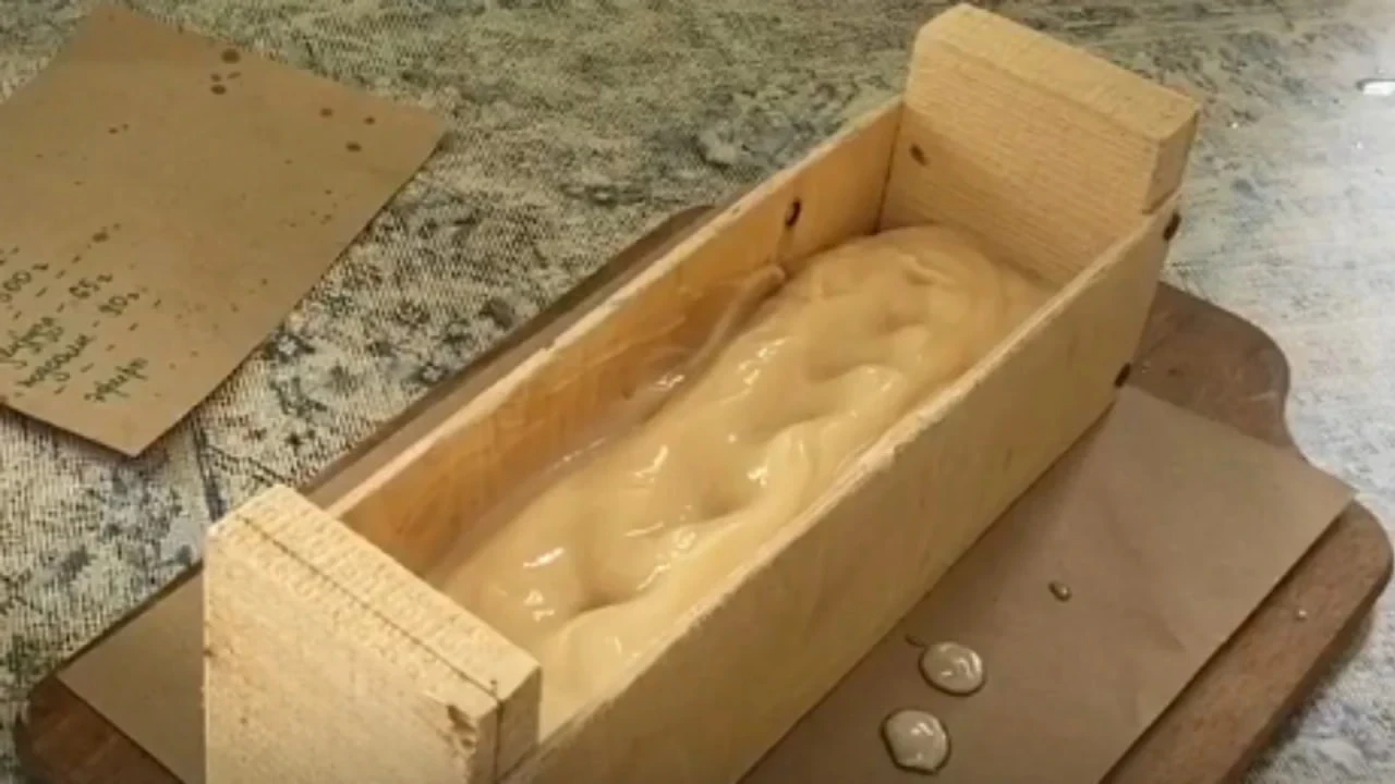 Перелейте массу в форму, разровняйте поверхность и оставьте мыло застывать в теплом месте на 1–2 дня до полного затвердения.