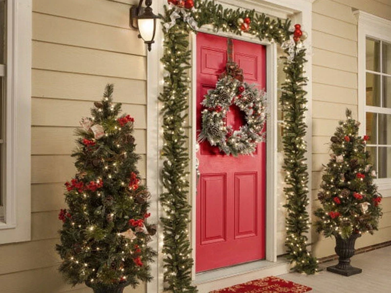 В частном доме можно украсить не только саму дверь, но и пространство вокруг нее. По обе стороны входа красиво смотрятся растения в кадках — мини-елочки, пихты или искусственная пуансеттия. Если используешь живые растения, убедись, что они переносят холод.