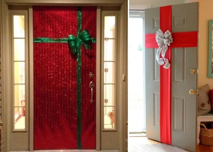 Интересно смотрится оформление лентами — если перевязать дверь вертикально и горизонтально, она будет напоминать большую подарочную коробку. Также на дверь можно повесить декоративные коньки, варежки, новогодний носок для подарков или игрушки ручной работы.