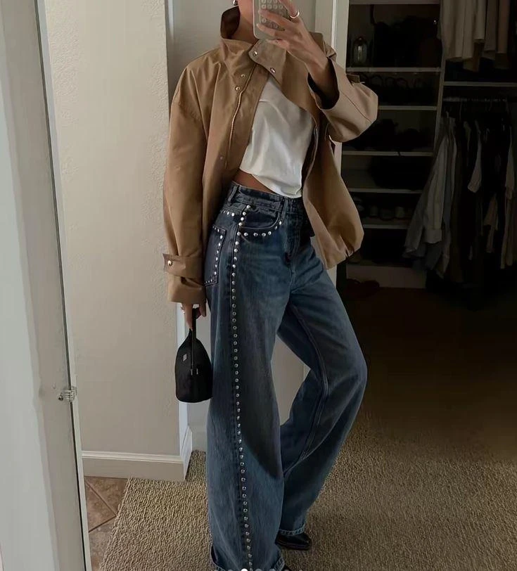 После нескольких лет минимализма в моду возвращается выразительный декор. Стразы, вышивка, заклепки — все это снова актуально. Такие джинсы становятся центральным элементом образа и привлекают внимание.