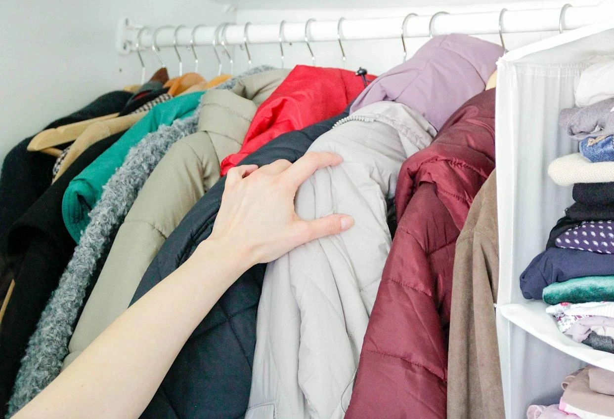Перед тем как убрать зимние вещи, нужно их пересмотреть. Соберите всю одежду в одном месте — например, на кровати. Так вы сразу увидите весь объем: куртки, свитеры, шапки, перчатки.