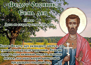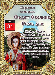 Необычный, христианский праздник Федот Овсяник и семь дев отмечается 31 мая. Православная церковь в этот день чтит память святого Федота. 31 мая принято гадать по дубу, каким будет урожай. Особое внимание уделяют различным травм, которые собирают и готовят из них различные настойки.