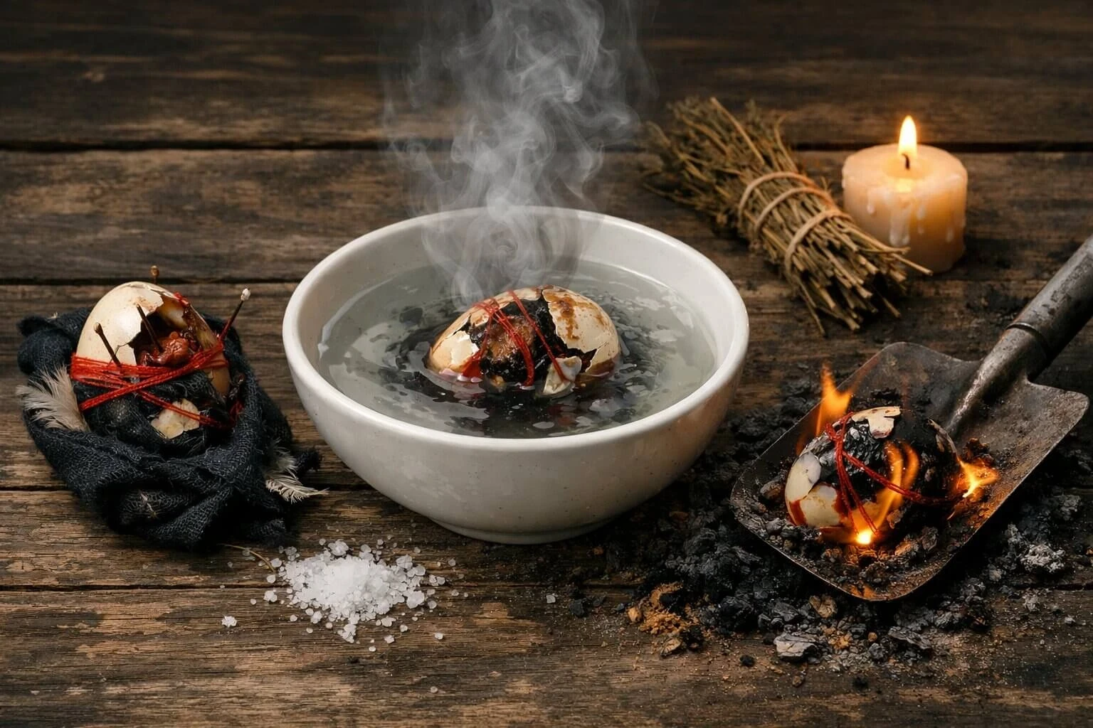 Один из распространённых способов нейтрализации такого подклада — сжигание. Яйцо кладут на кусок картона или дощечку, относят подальше от дома и сжигают. При этом важно стоять с наветренной стороны: считается, что дым от горящего предмета с негативной энергетикой способен навредить здоровью и принести жизненные неурядицы тому, кто его вдохнёт.