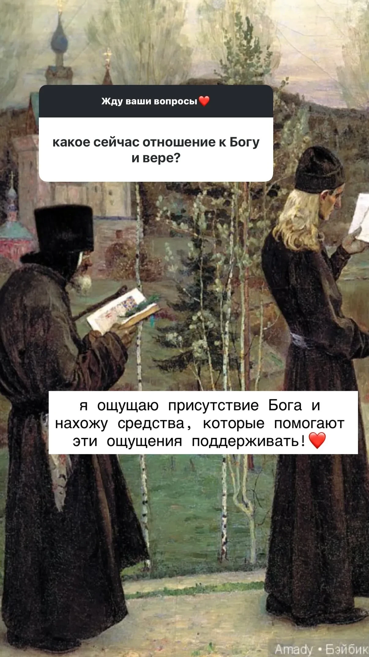 Сторис* Насти ИвлеевойКроме того, блогерша вновь упомянула, что справиться с депрессией ей во многом помогла вера, отметив, что с тех пор "ощущает присутствие Бога" в своей жизни.