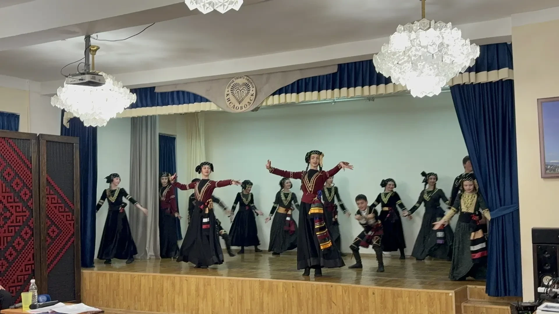 Эстетическое продолжение литературной части обеспечил народный хореографический ансамбль «Иверия». Коллектив представил серию красочных национальных танцев — «Самая», «Аджарский», «Рачули» и «Мтиулури» — где каждый номер отличался выразительной хореографией, яркими костюмами и искренней эмоциональностью исполнителей. Танцы гармонично дополнили повествовательную линию вечера, придав празднику динамику и национальный колорит.